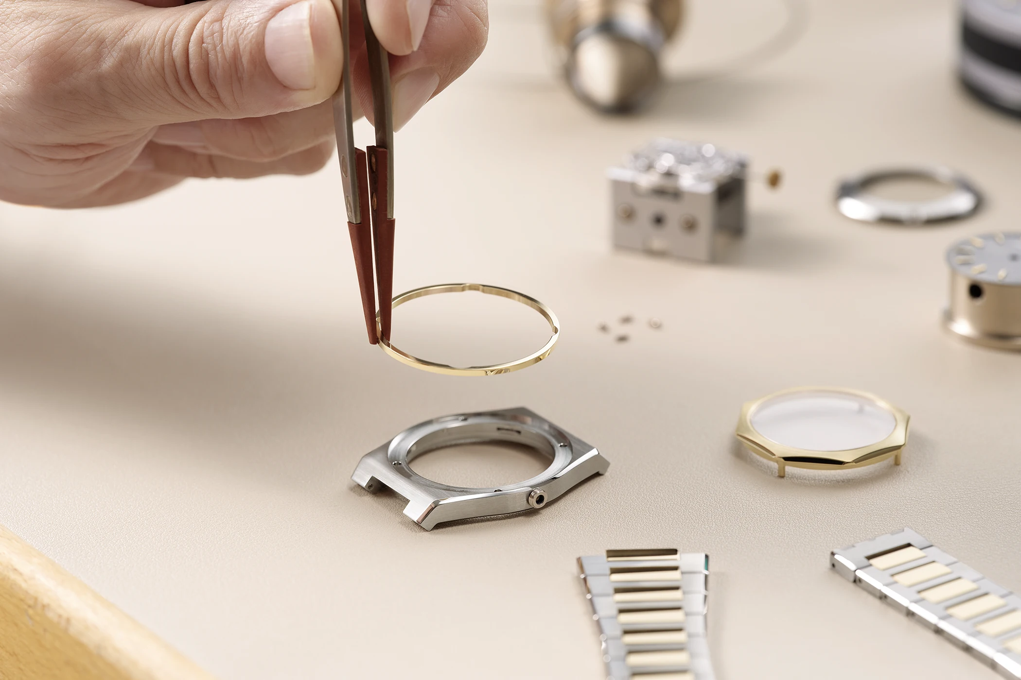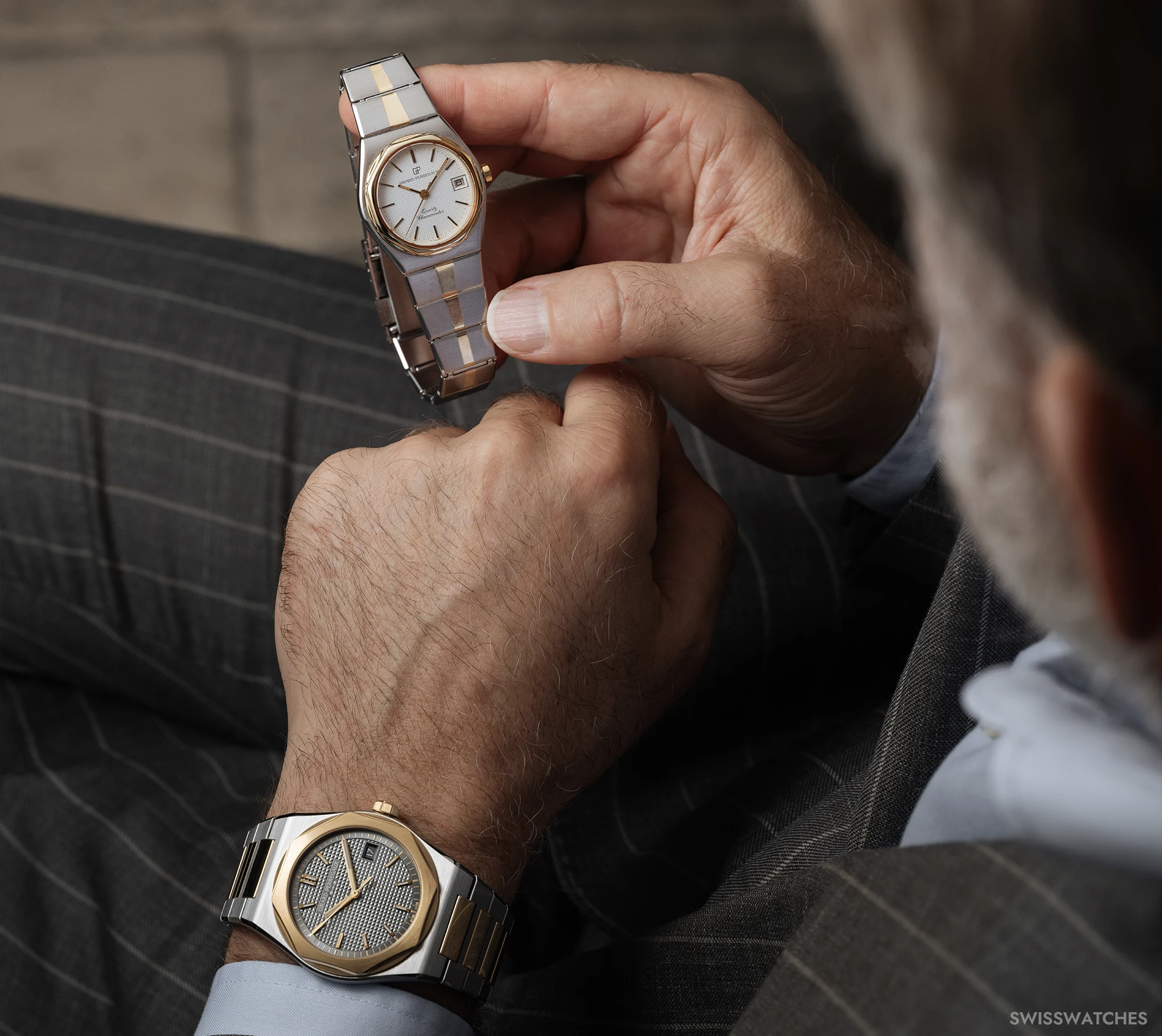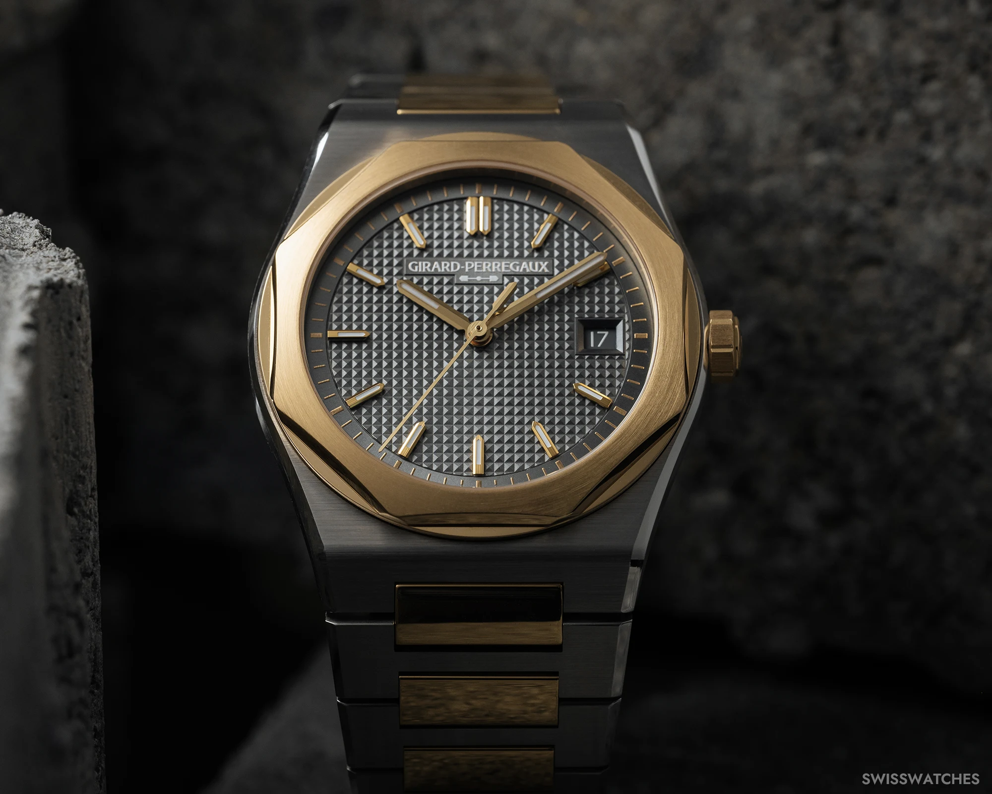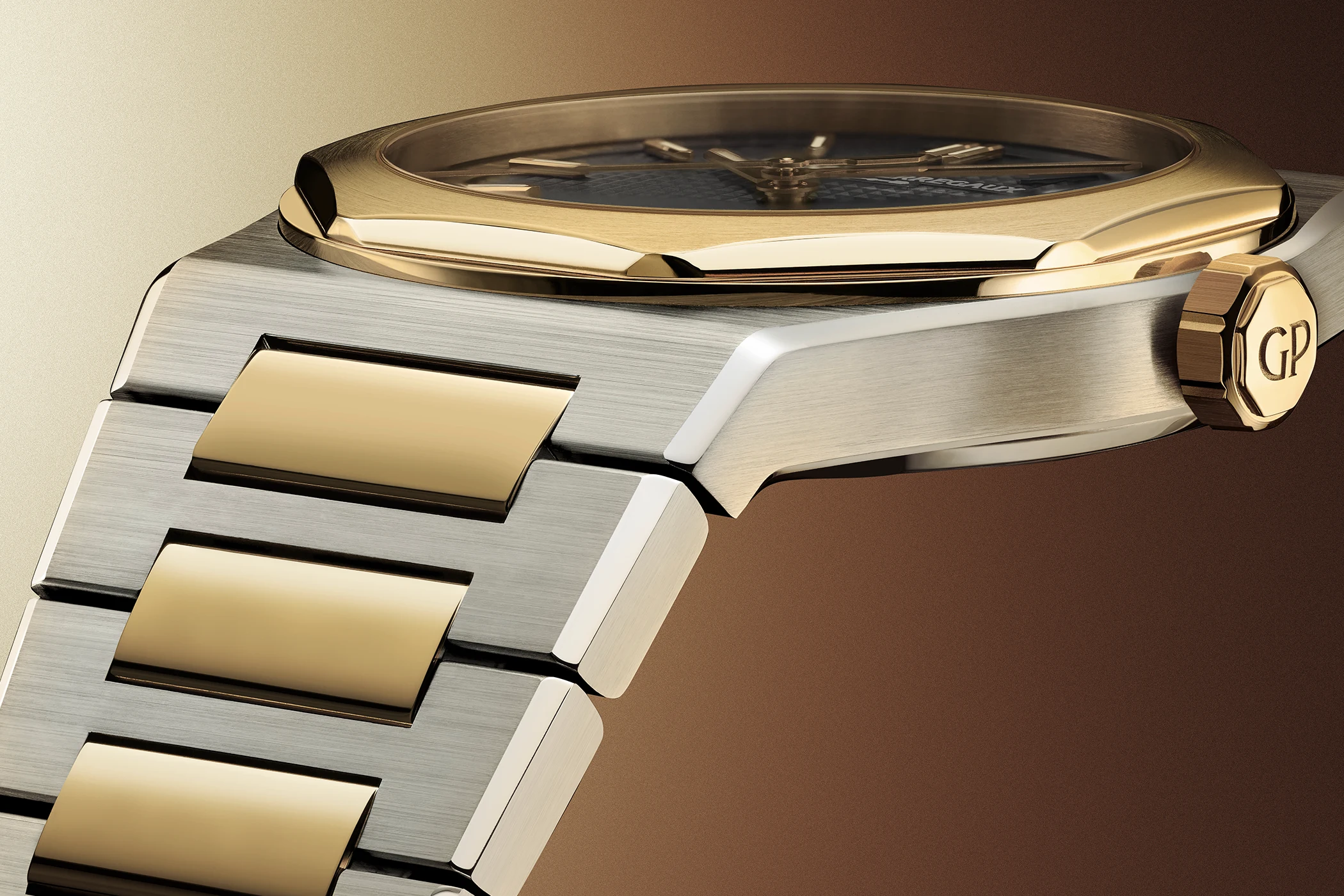 In the wake of this development, Girard-Perregaux introduced its own take on the concept in 1975: the Laureato. Characterised by a slim, tonneau-shaped stainless steel case with a bi-colour metal bracelet integrated into the design, the watch featured a Clous-de-Paris pattern on the dial – a detail still central to the collection today – complemented by simple baton markers and hands. However, it was the polished, octagonal bezel that gave the Laureato its distinctive aesthetic.