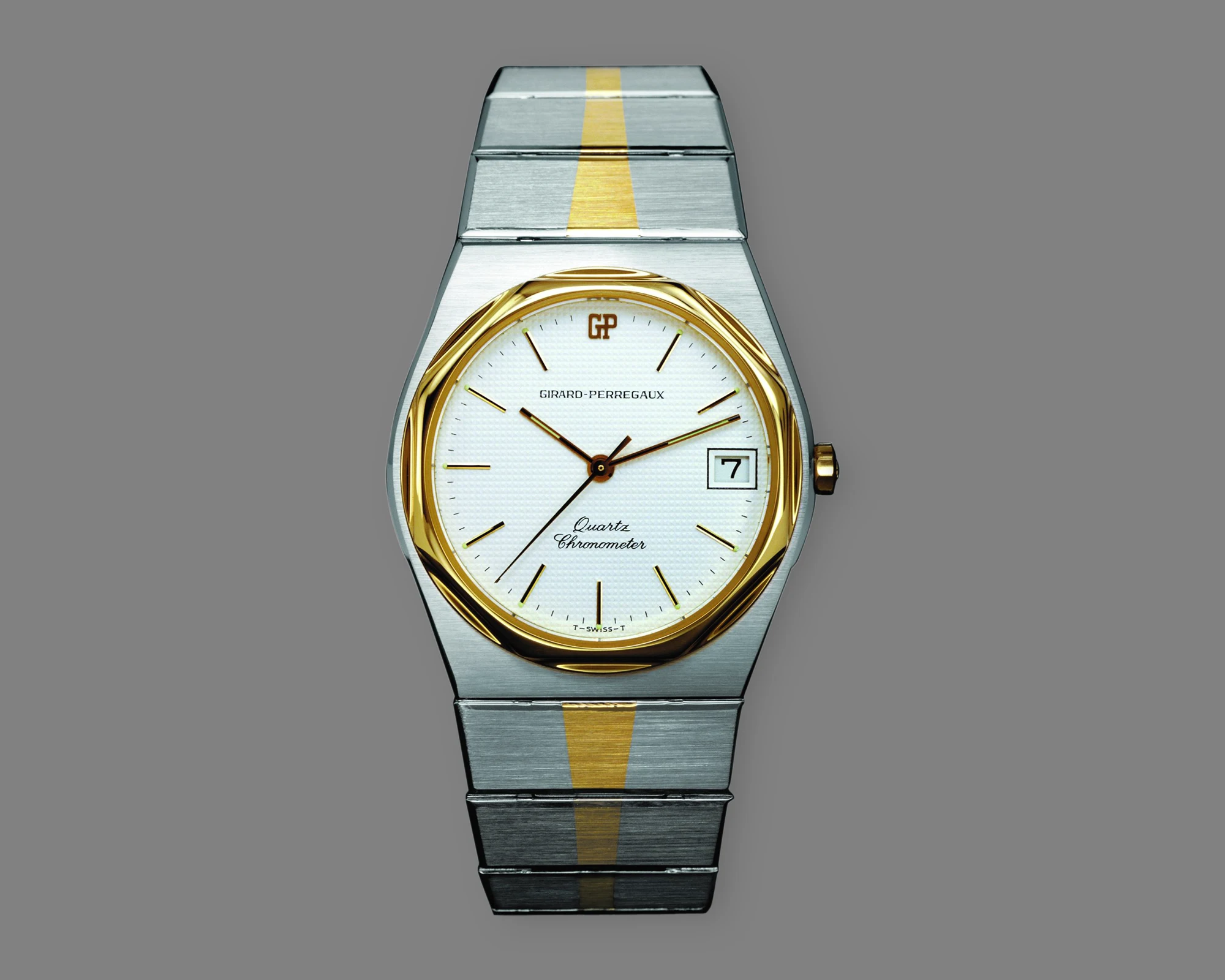 Unlike many of its contemporaries, however, the Laureato was not the result of Genta’s creativity. Instead, it was penned by a young architect from Milan. The first Laureato model, launched in 1975, was powered by quartz technology – a reflection of Girard-Perregaux’s efforts at the time to set new chronometric standards in the field of quartz. As early as 1966, the company had established its own research and development division to explore the potential of quartz systems. Five years later, this division introduced the GP350 calibre – a quartz movement operating at 32,768 Hz, a frequency that would go on to become the global standard for quartz timekeeping. In 1977, two years after the launch of the Laureato, no less than 83% of the quartz patents registered with COSC were held by Girard-Perregaux.