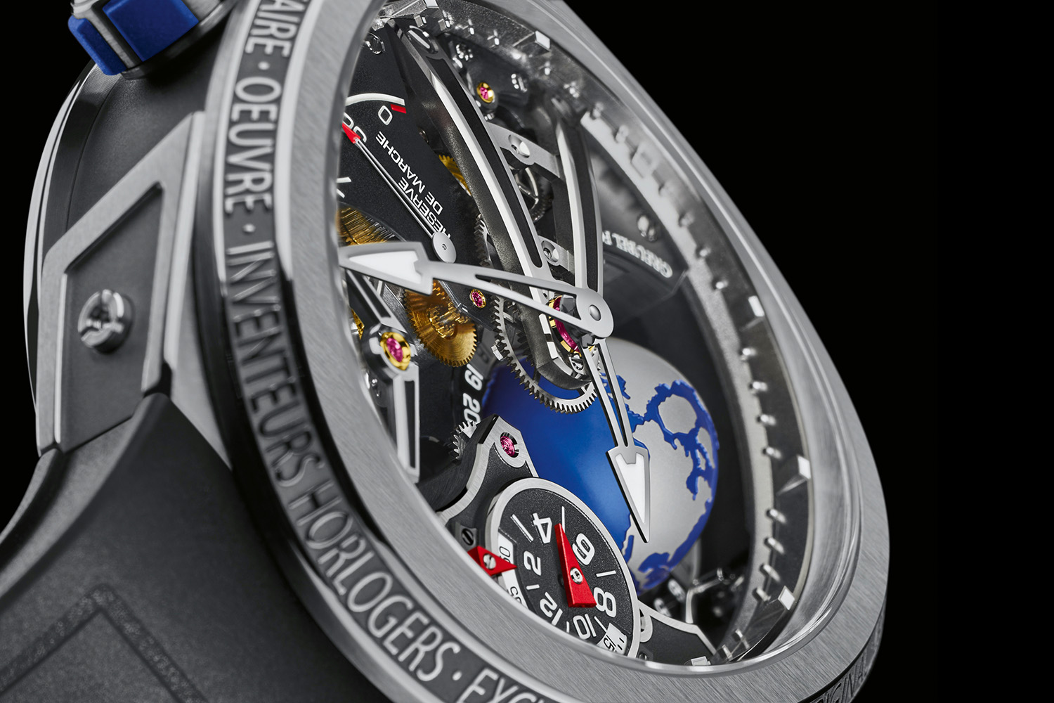 The focus of the sporty GMT Sport is on legibility and efficiency. The hours and minutes are displayed by concentric openworked hands whose curved profile follows the curvature of the case and movement. Mounted on the suspended arch center bridge with black treated openings, the gear train literally follows the curve of the bridge, overlooking the globe to drive the hour and minute hands. The triangular tips of the arrow-shaped hands and the markers on the minute-hour-ring are enhanced with luminescent coating. An auxiliary dial between 10 and 11 o’clock combines the small seconds on a large rotating disc, and the second time zone display with a hand. The 72-hour power reserve (ensured by two coaxial barrels in series) is indicated on a sector at 3 o’clock with its openworked hand and highlighted red triangle. Housed underneath the arched bridge, the power reserve differential is subtly engraved with Greubel Forsey’s values.
