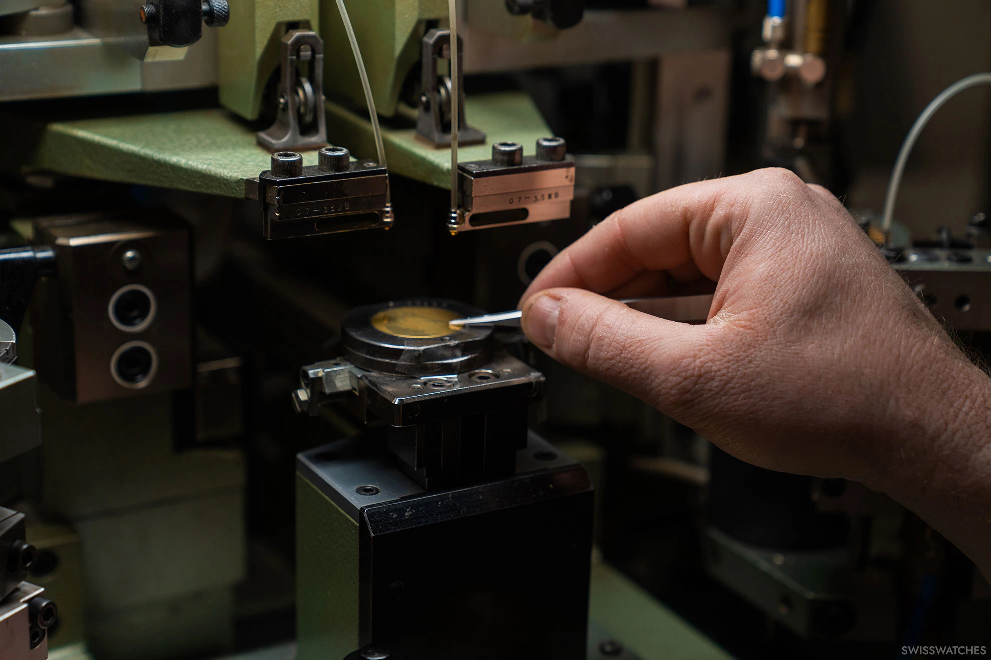 Each dial undergoes a soldering process at the opposite station to attach the dial feet. These small supports, usually two or more, are placed into the dial and then soldered in place using an electric current. Measuring around 0.55 mm, these tiny feet are essential, providing both stability during assembly and reference points for proper alignment during the subsequent stages, such as various decorative and technical treatments.