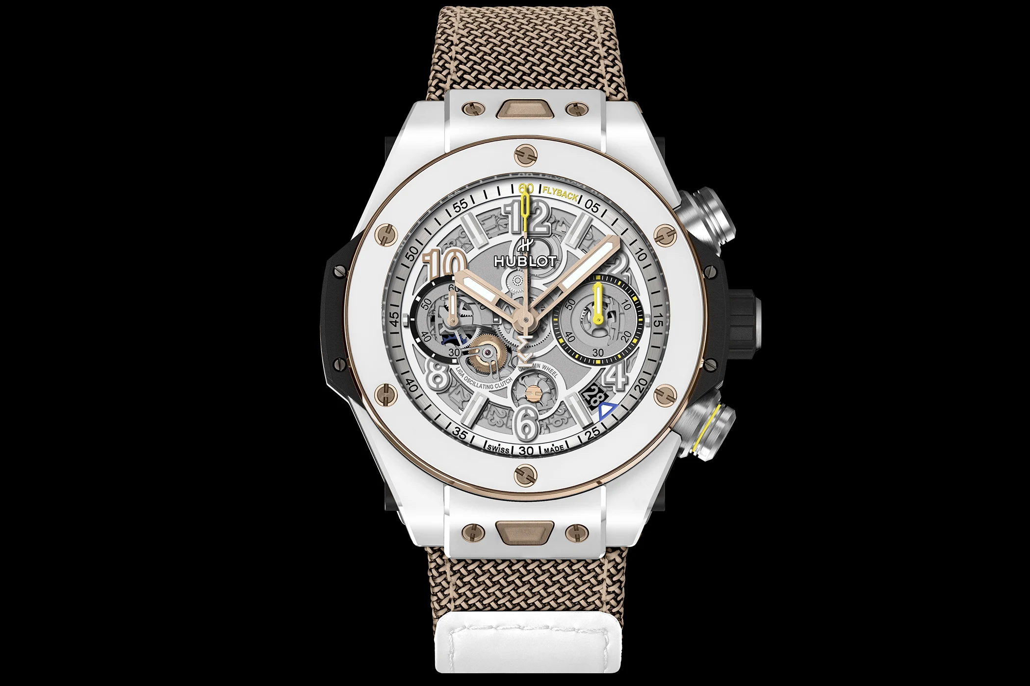 The Big Bang Reloaded does not adopt a neutral stance, but takes a very clear position. Hublot translates Bolt’s career, his background and his public image into a design that aims for immediate impact. It is bold, yet executed with precision from start to finish, and is characterised by a remarkable attention to detail. The Bolt Edition captivates with striking symbols, strong contrasts and a design that clearly conveys its message. Even the two interchangeable straps – a yellow gold Velcro strap and a black, yellow and green camouflage rubber strap – are part of this clear statement.