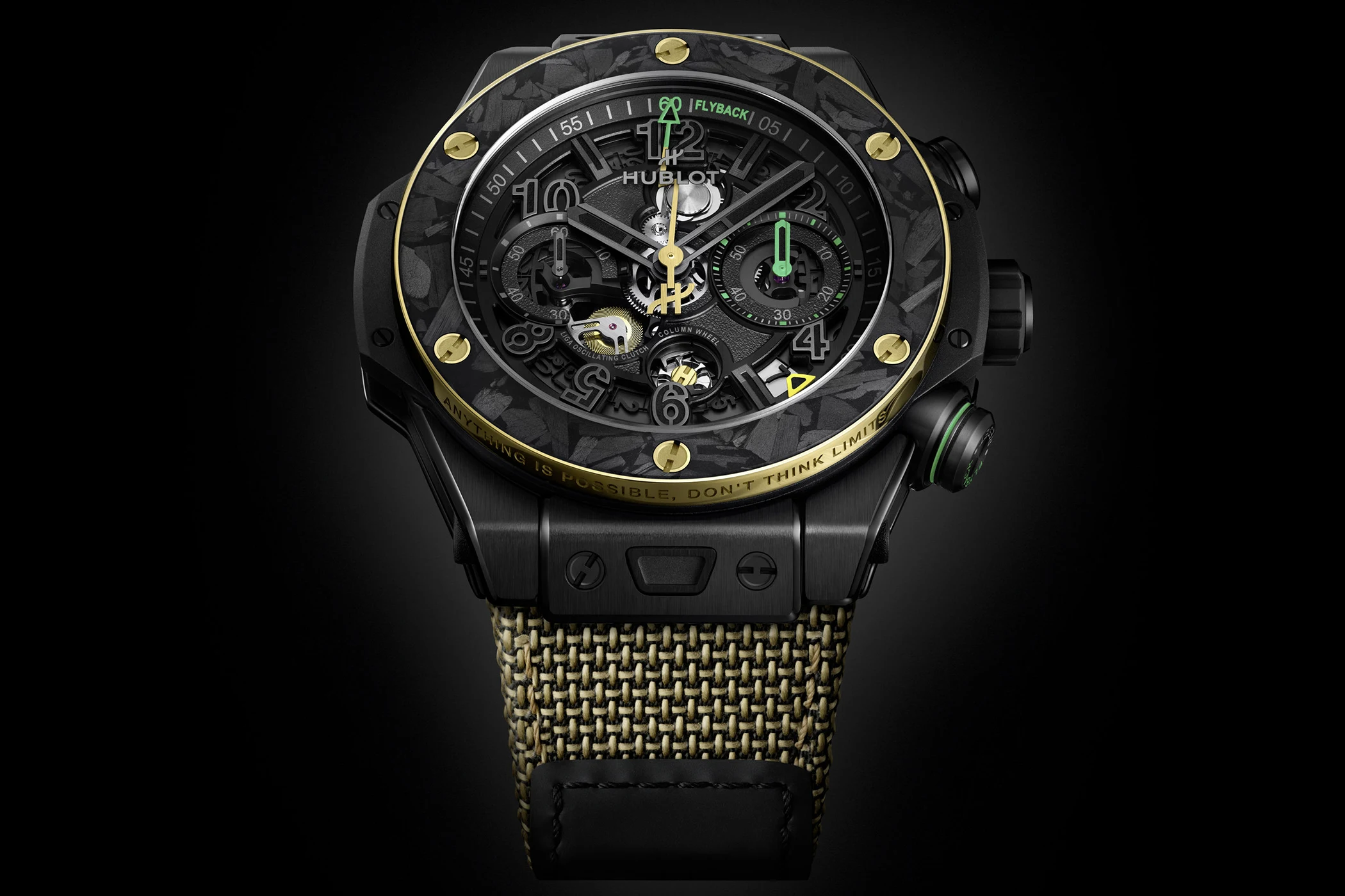 The Big Bang Reloaded Usain Bolt is entirely tailored to the symbolism of the world’s fastest man: the 44-millimetre case, crafted from black ceramic and carbon, is accentuated by yellow gold details, whilst green and yellow accents deliberately reference the colours of the Jamaican flag. The Big Bang Reloaded becomes particularly interesting when Hublot takes personalisation to the finest detail: if you mentally rotate the watch, the numerals between 6 and 8 o’clock form a “958” – a direct reference to Bolt’s world record time of 9.58 seconds over 100 metres set in 2009. In keeping with this theme, the chronograph hand is shaped like a lightning bolt, and the case back even features a visible integration of original soil from his training ground in Jamaica. Added to this is the engraving of his motto “Anything is Possible, Don’t Think Limits” on the bezel.