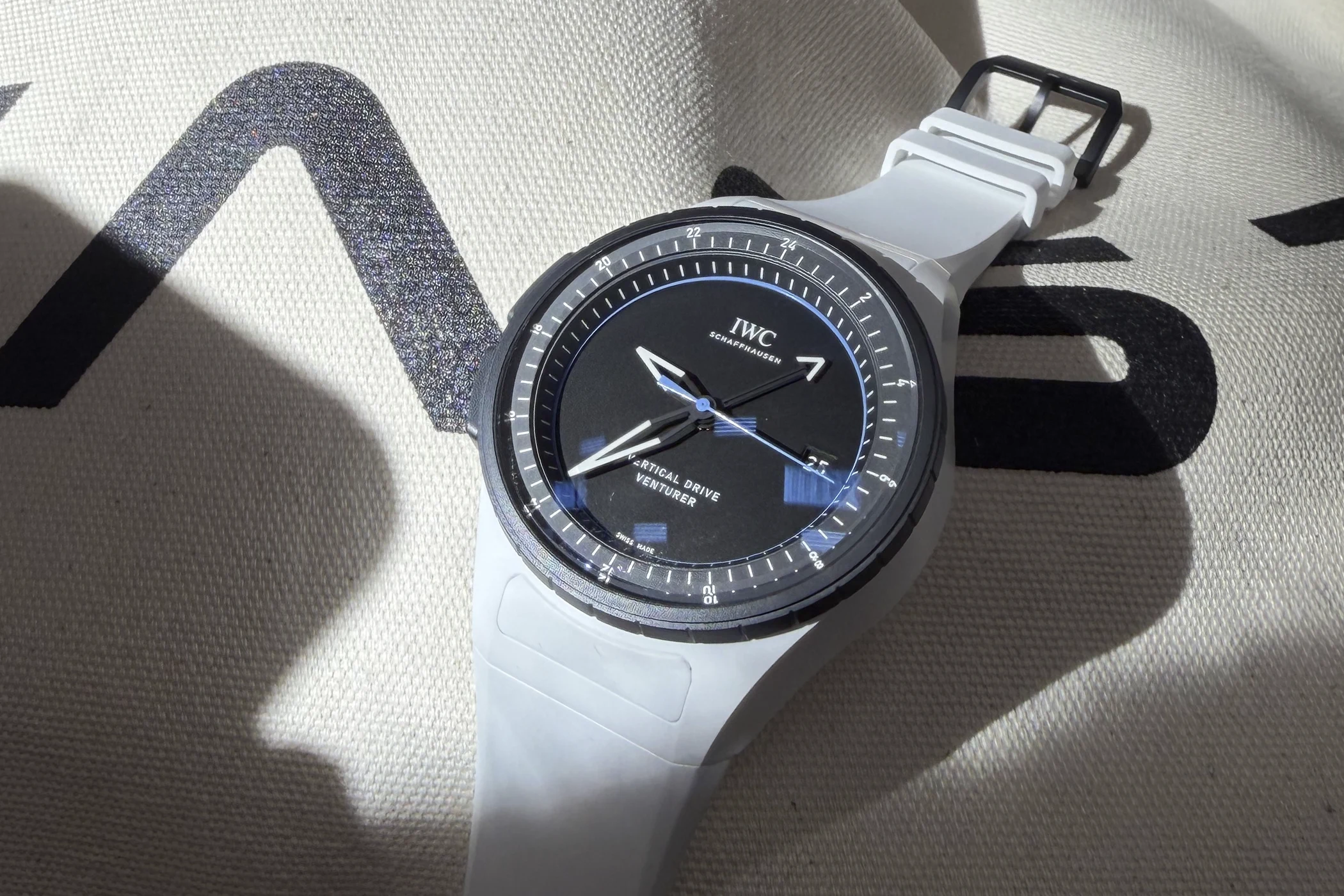 Despite its GMT function, it is certainly not a watch for everyday wear. It is more of a second or third IWC. Due to the absence of a crown and the seamless transition from case to strap, it feels smaller on the wrist than its actual dimensions would suggest, yet it is anything but a small watch. At xxxxx euros, it is also not an entry-level model into the Schaffhausen brand’s world. The white ceramic stands out. The Venturer is a ‘talking piece’, a design object on the wrist, pure in its design, opulent in its symbolism. Built for space travel, equally at home on any of our seven continents, worn with a T-shirt and jeans rather than a space suit.