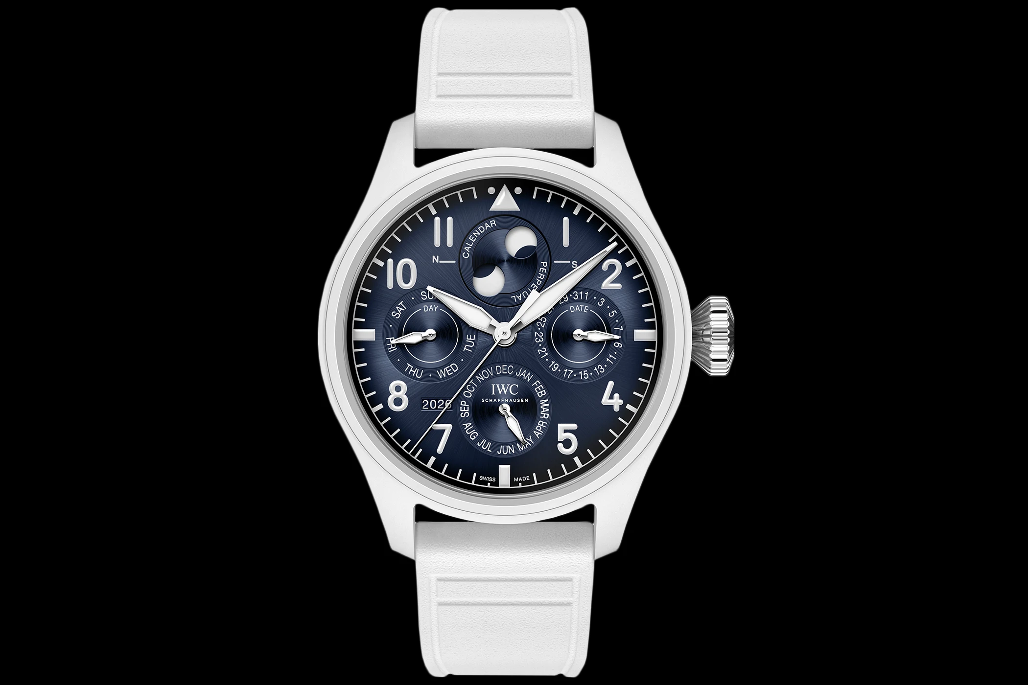 The new movement is making its debut in three different versions: firstly as the Big Pilot’s Watch Perpetual Calendar ProSet Le Petit Prince (reference IW329601, €38,300) in a 42-millimetre steel case with a dark blue dial and a steel bracelet, to which a dark blue rubber strap can also be easily attached thanks to the quick-release clasp. Secondly, as a rose gold version as part of the regular collection with a dark green dial (reference IW329602) and a green leather strap. And last but not least, there is the Petit Prince version with a white ceramic case, which increases the case size to 43 millimetres and, in contrast to the deep blue dial, is a real eye-catcher (reference IW339601, €40,900).
