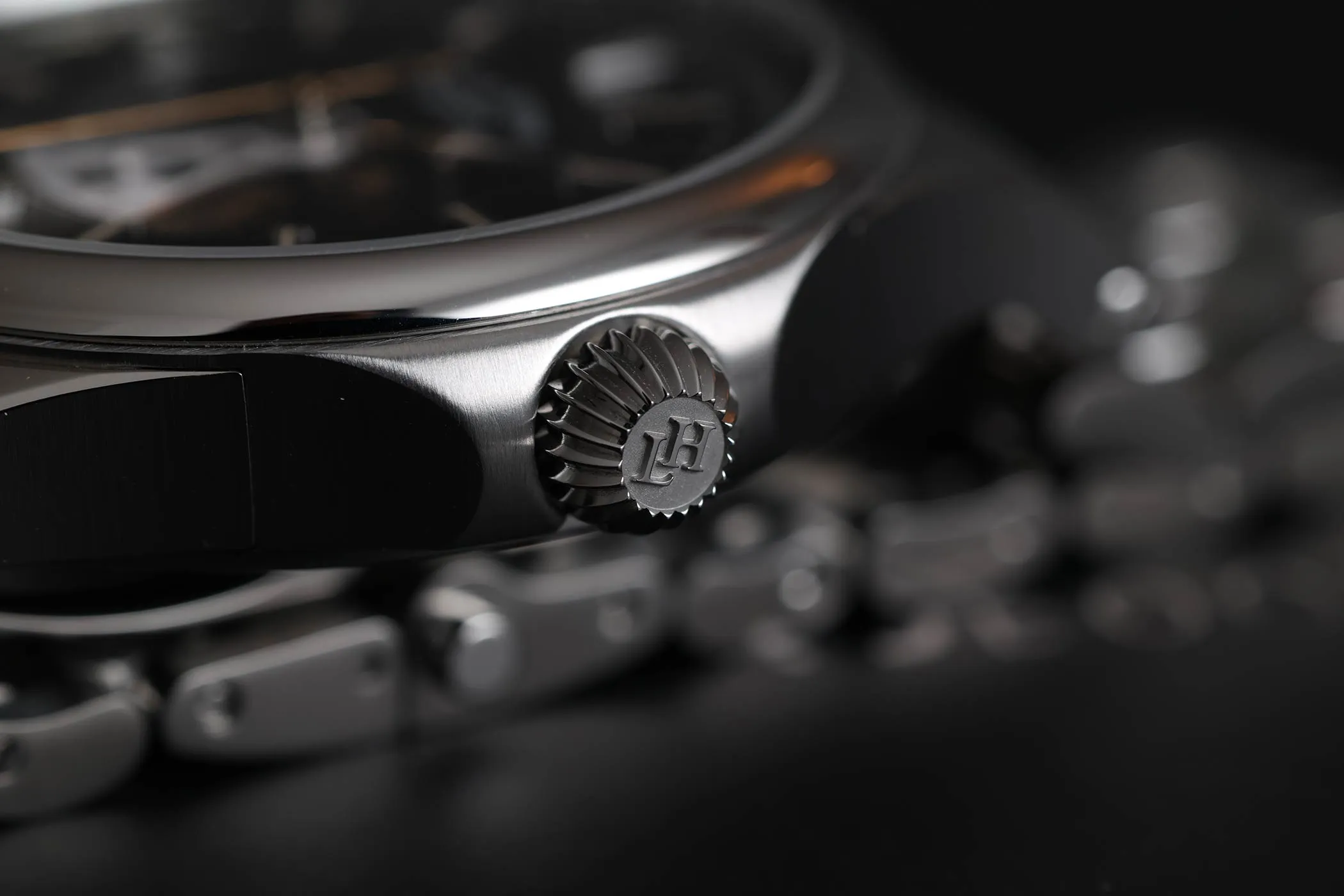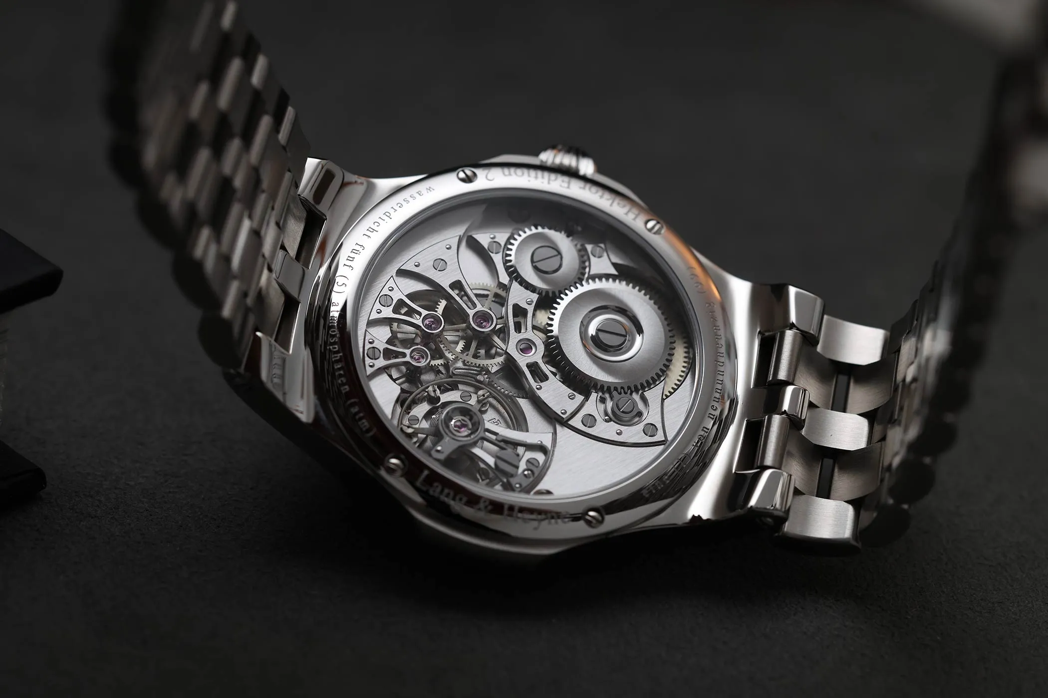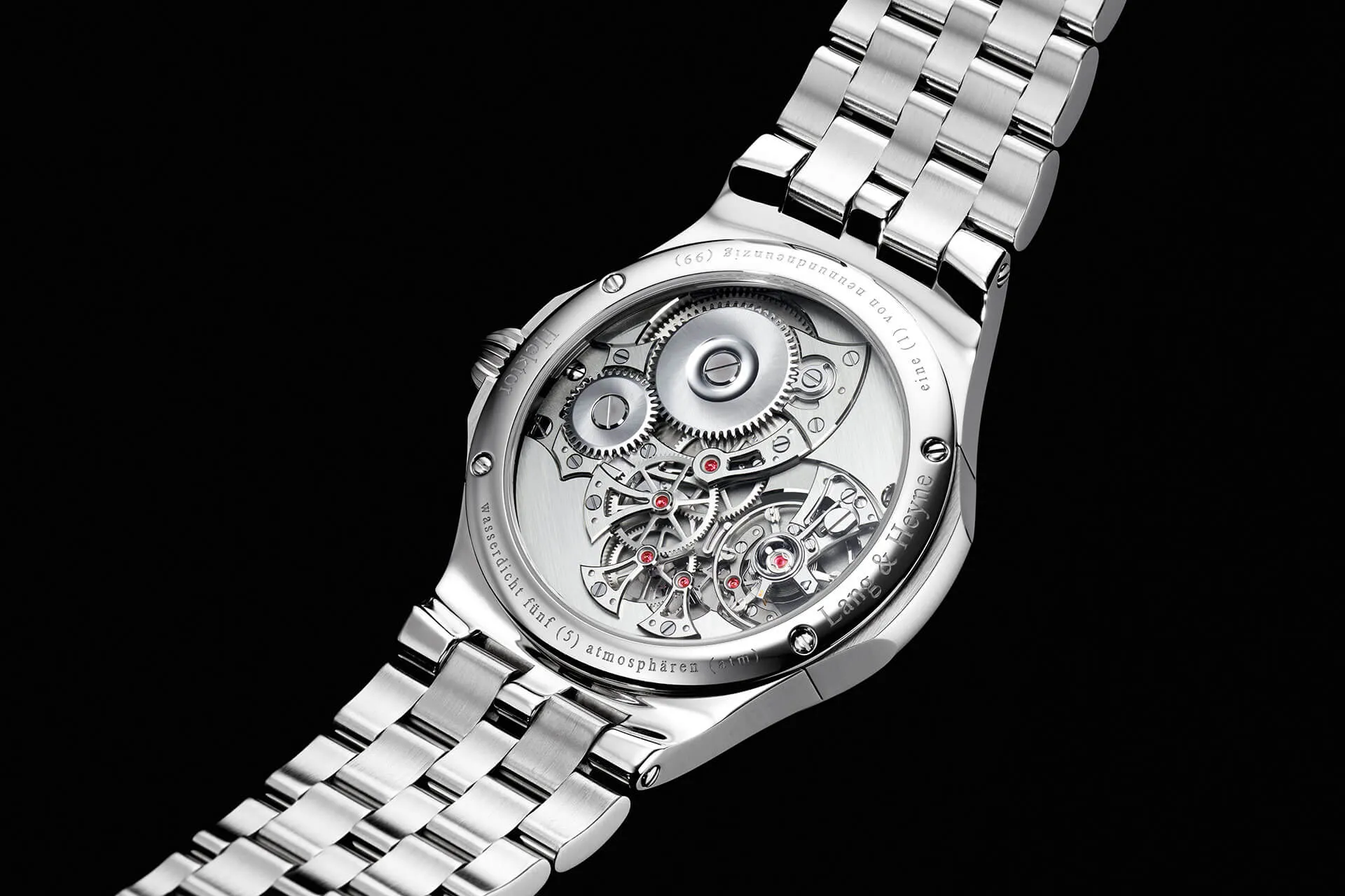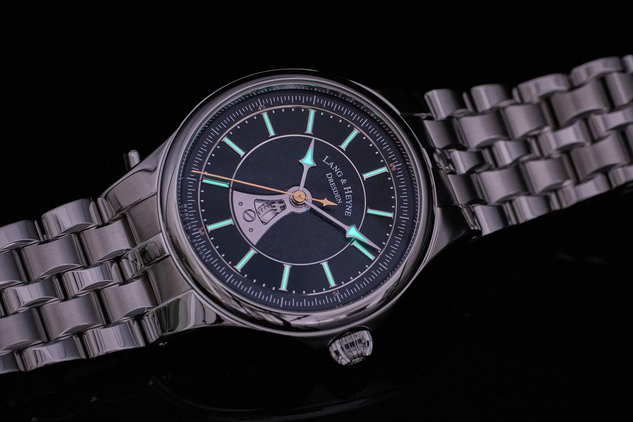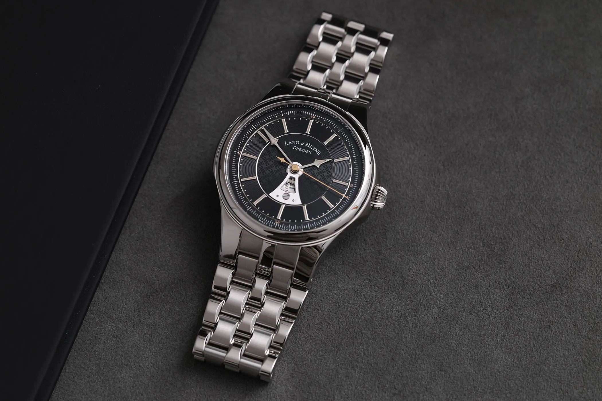The stainless-steel case with crown protection and the integrated stainless-steel bracelet make the watch robust, especially when compared to a scratch-sensitive gold case. Thanks to its increased water resistance of up to 5 bar, the wearer can even go swimming with the watch. In addition, the luminous material on the indices and hands ensures easy readability in the dark, which is not the case with the hand-engraved gold hands and blued steel hands of the other models. The Hektor is therefore equipped for modern everyday life. However, the Hektor is just as little a pure tool watch as it is a classic Lang & Heyne in a steel case. With a special hand-wound calibre and a distinctive design with visible mechanics on the dial side, it focuses on individuality.