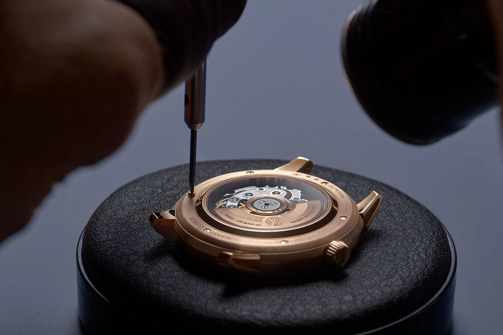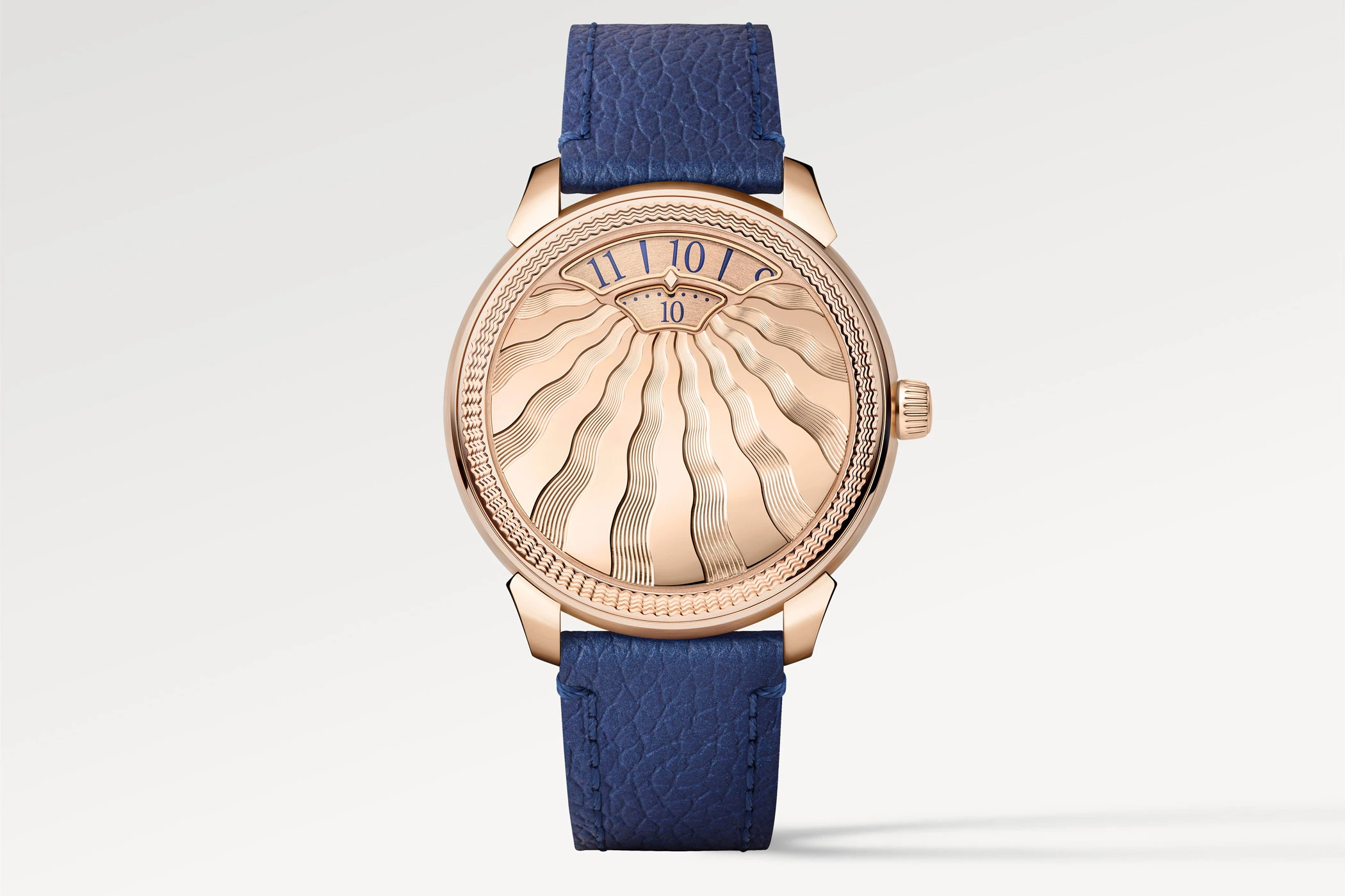 The rose gold cover on the front of the watch is a sophisticated competitor when it comes to catching the eye. In a complex handcrafting process, the artisans at the Louis Vuitton Manufacture have guilloché rays of light emanating from the time display at 12 o’clock into the precious metal, complemented by a wave-shaped ring. To achieve this visually and haptically fascinating effect, machines from the mid-19th and early 20th centuries were used, which were restored over several months at the Fabrique des Arts, where Louis Vuitton pools its expertise in the field of craftsmanship.