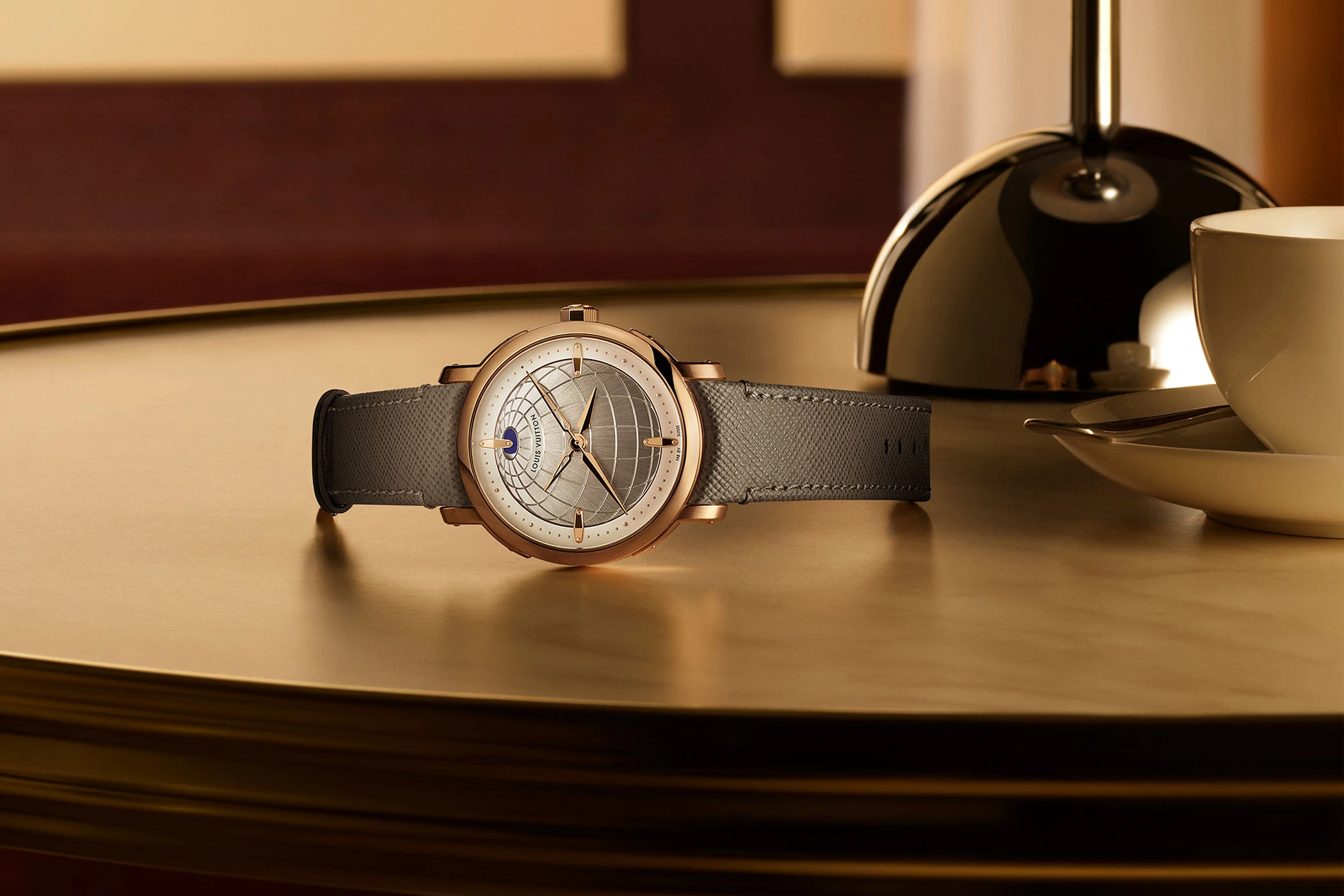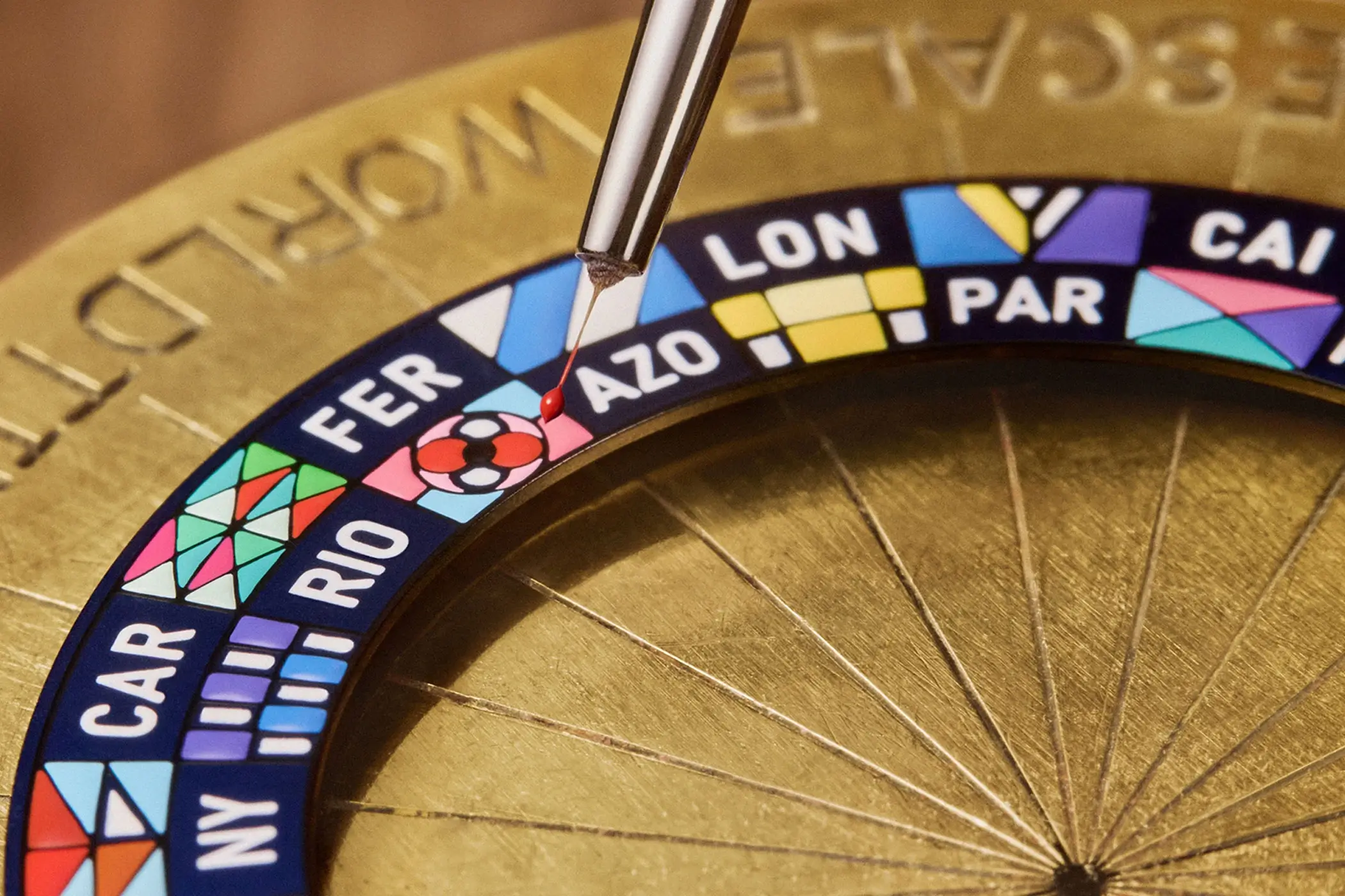 The highlight: the Escale Twin Zone has two sets of hands arranged on a single axis – a design rarely found in GMT watches. In addition, there is an independently adjustable minute hand that allows for minute-by-minute adjustment in all time zones, even those with non-standard deviations. Adjustment is carried out using the two-stage crown. The solid hands indicate the local time, while the skeletonised hands indicate the home time. The day/night indicator is located at the top of the engraved globe.