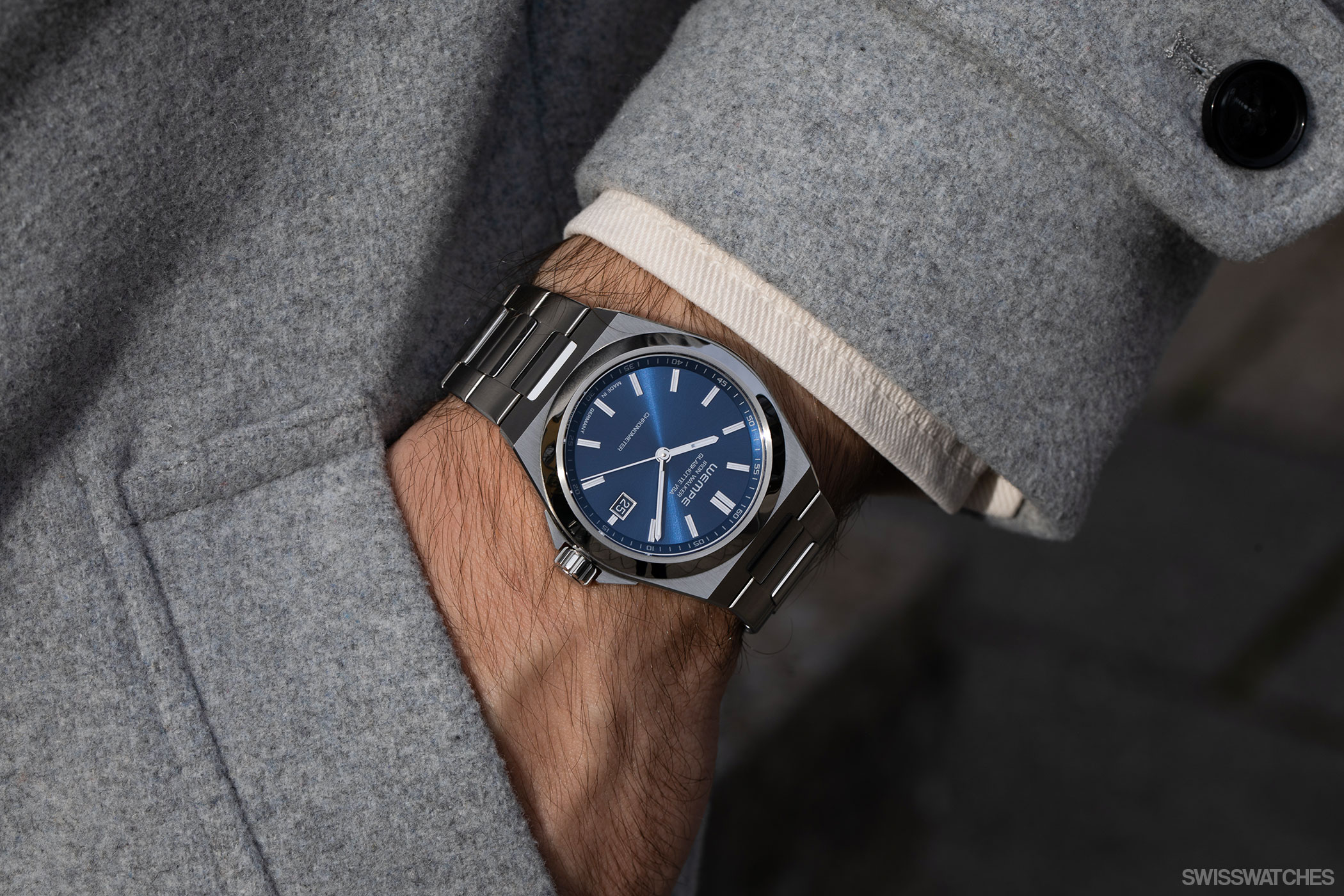 Wempe uses the high-quality 316L stainless steel, which has been matted on the surface and polished for the edges. The flank protection, which can be seen on all models, is elegantly designed, as well as another indication of an independent sports watch’s DNA. Another nice detail that watch enthusiasts often rub shoulders with is the date disc, which here has been colour-coordinated with the dial. The date can be set independently of the time display via the crown. If you are interested in the new, larger XL Chronographs in 44 mm, you should know that the blue dial is shinier due to the sunburst finish, unlike the blue used on the other model variants. There is also an alternative version with a matt black dial.