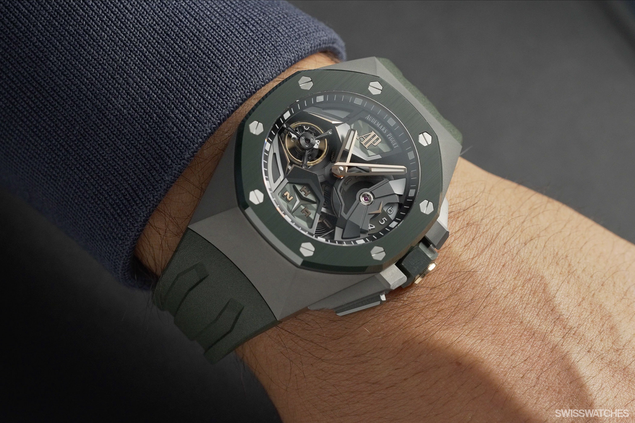 Last but not least, we have the brand new 44 mm timepiece: the sand-blasted titanium Royal Oak Concept Flying Tourbillon GMT. It entices the wearer with its subtle green ceramic green elements, matched with pink-gold tones. The bezel, crown and pushers are made of green ceramic and have been hand-finished with alternating satin and polished bevels.