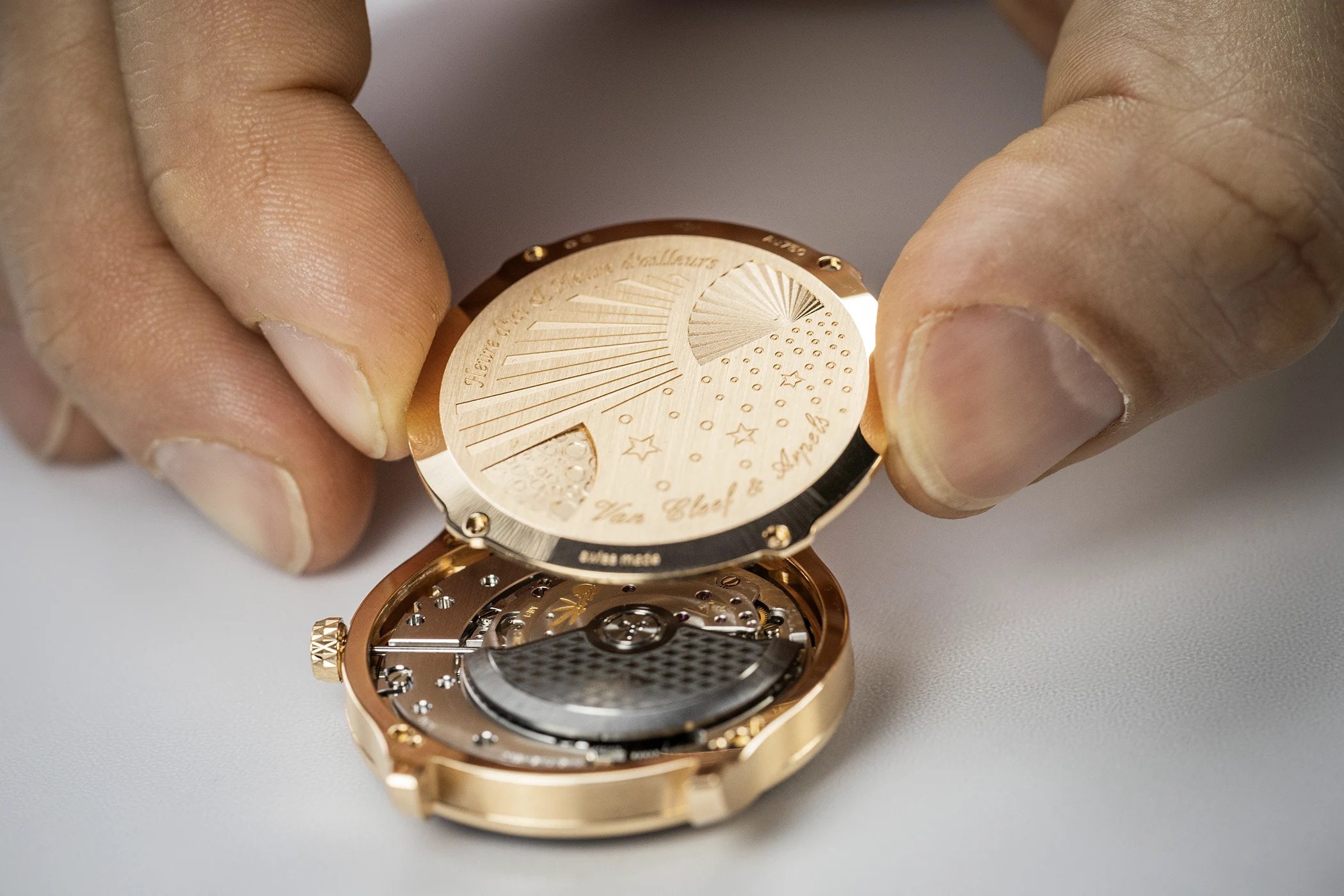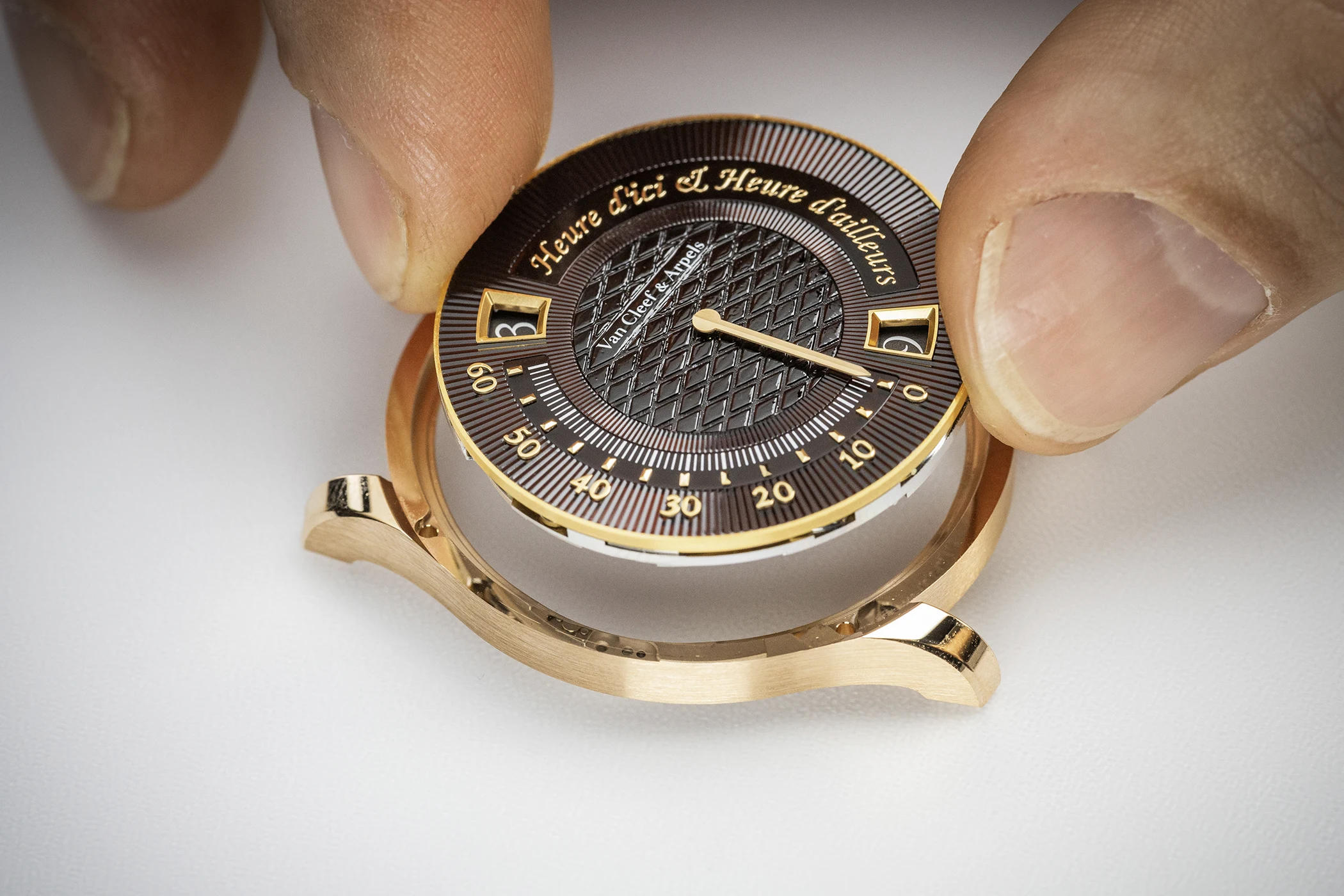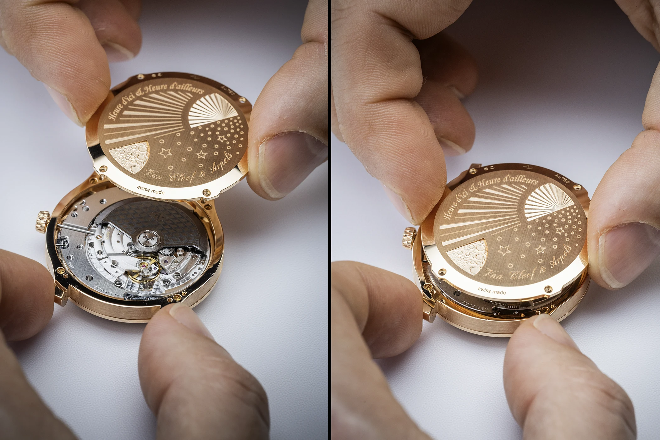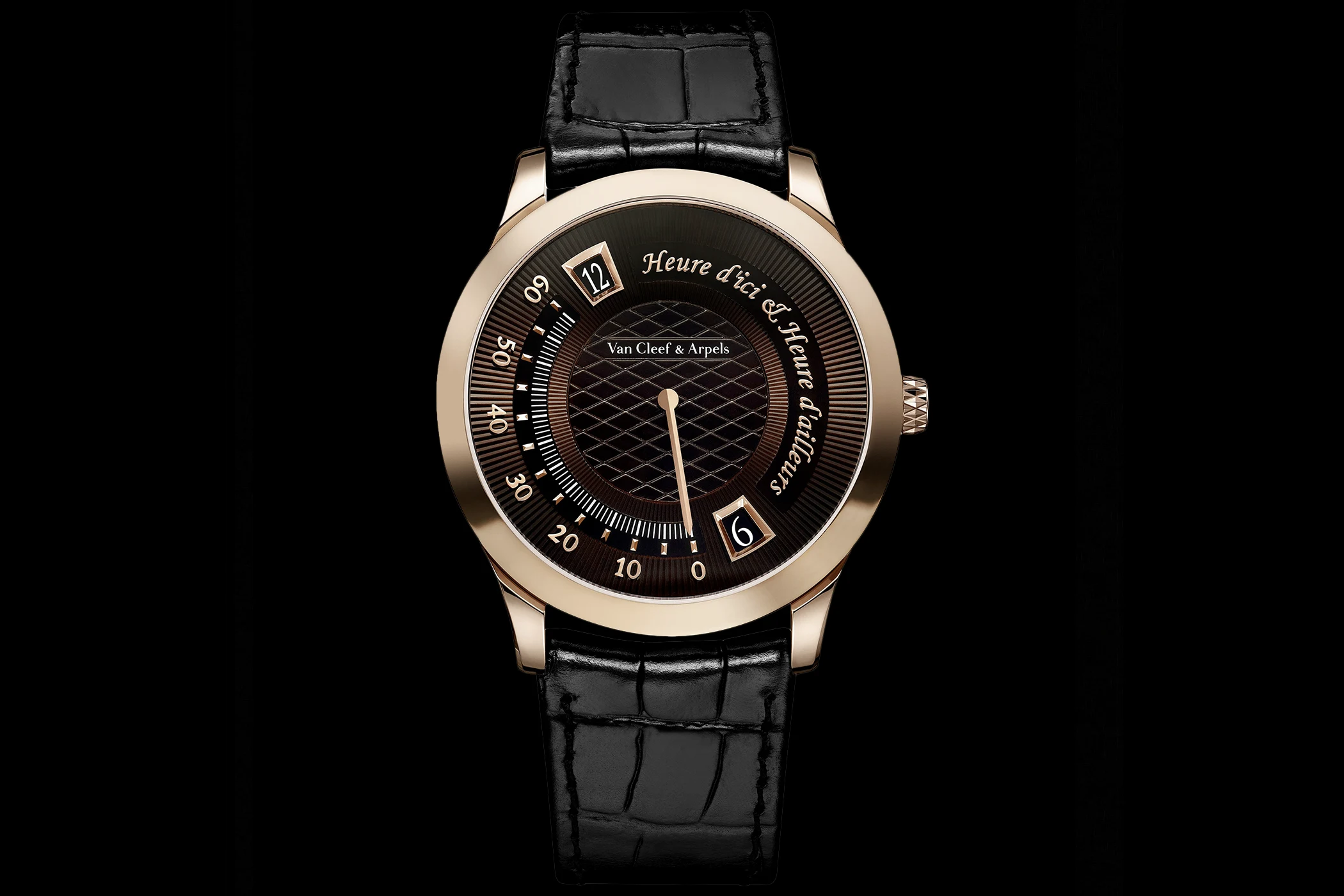 The case of the Midnight Heure d’ici & Heure d’ailleurs measures 38 mm in diameter and is crafted from rose gold. With its warm hue, the polished and satin-brushed metal harmonises beautifully with the glossy brown dial and the rose gold details set upon it. The crown, too, establishes a visual link to the dial, with its lozenge pattern echoing the Piqué motif. In keeping with Van Cleef & Arpels’ characteristic ‘Poetry of Time’ philosophy, a dreamlike engraving adorns the closed caseback. Arranged diagonally across the upper section are a guilloché sun and the model name in italic script. Beneath this lies a depiction of the moon accompanied by a starry sky and the name of the Maison.