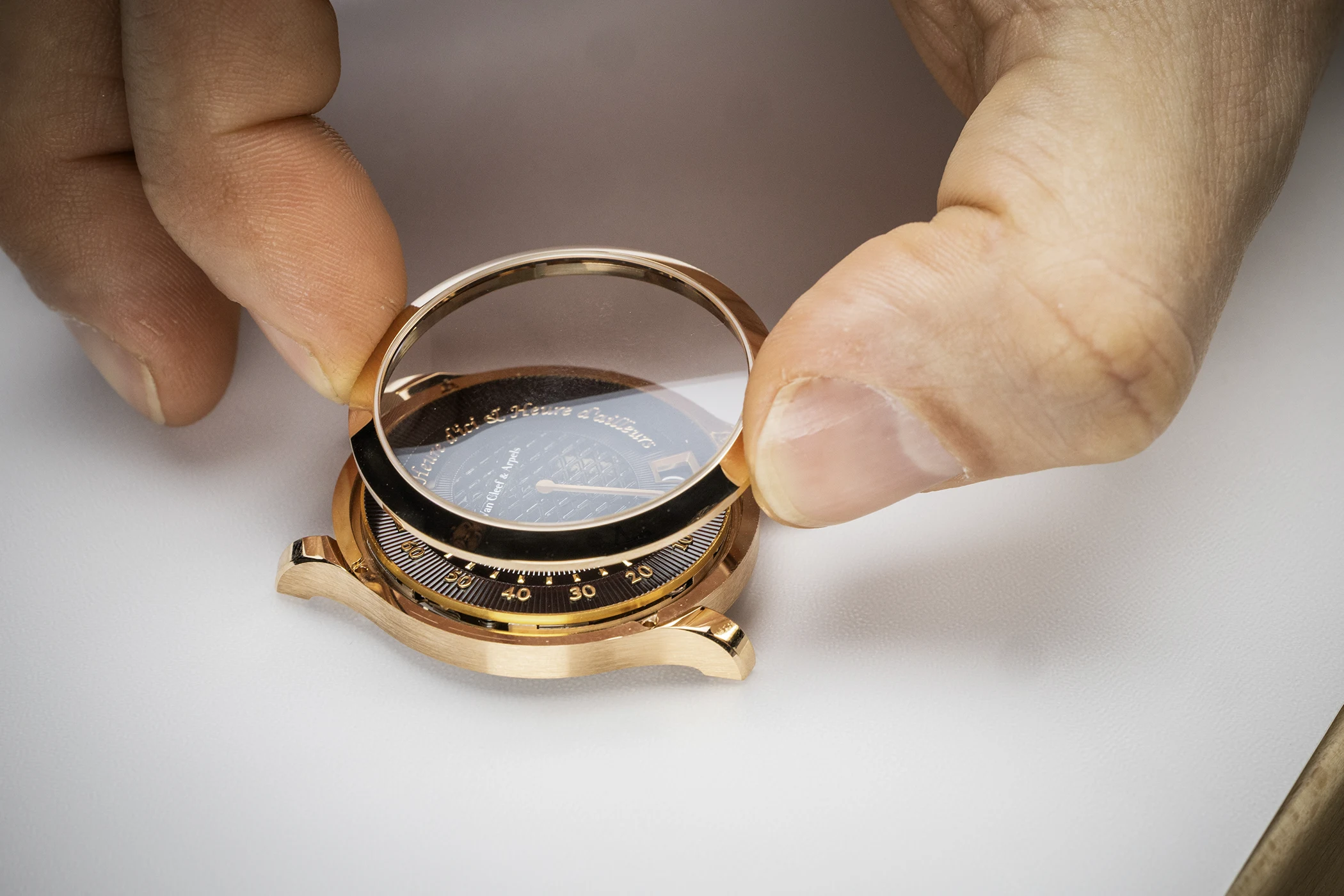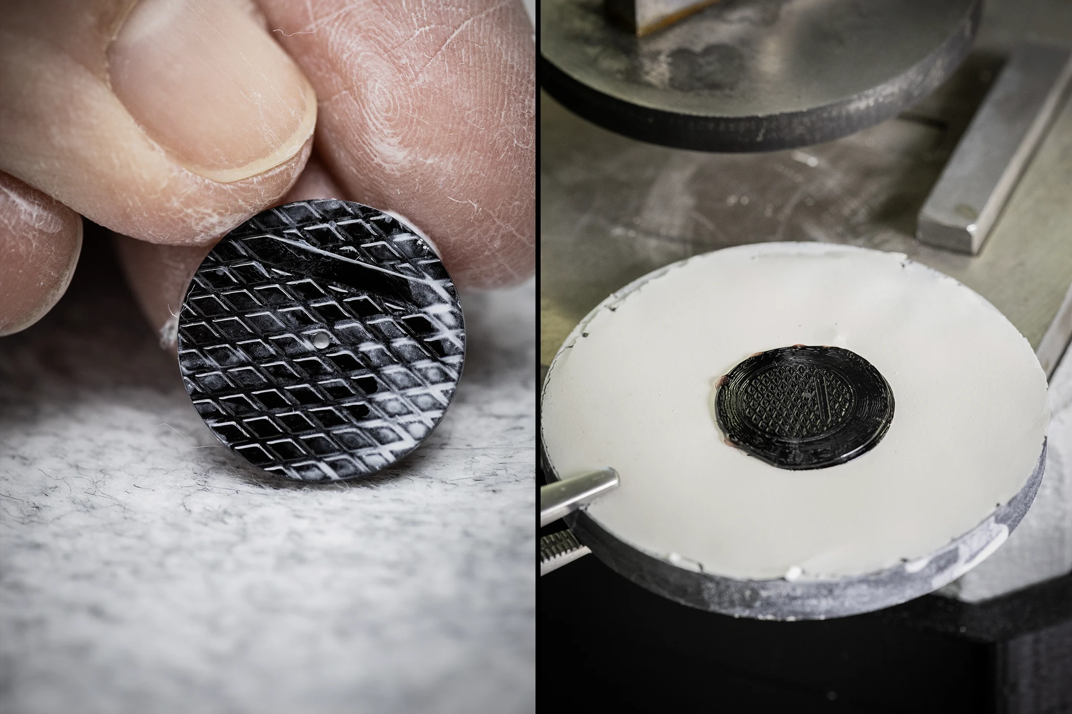 However, this was only part of the challenge. The enamel also had to incorporate two decorative elements that subtly referenced the Maison’s signature design codes: a Piqué motif and a guilloché pattern that radiated outwards to the edge. Creating these on enamel was particularly challenging, as it required enamel with two different levels of colour intensity. The thickness of the layer influences both the hue and the so-called ‘chatoyance’ – the way light plays within the material. For the relief motifs, the artisans drew inspiration from glassblowing techniques that had been specially adapted for watchmaking.