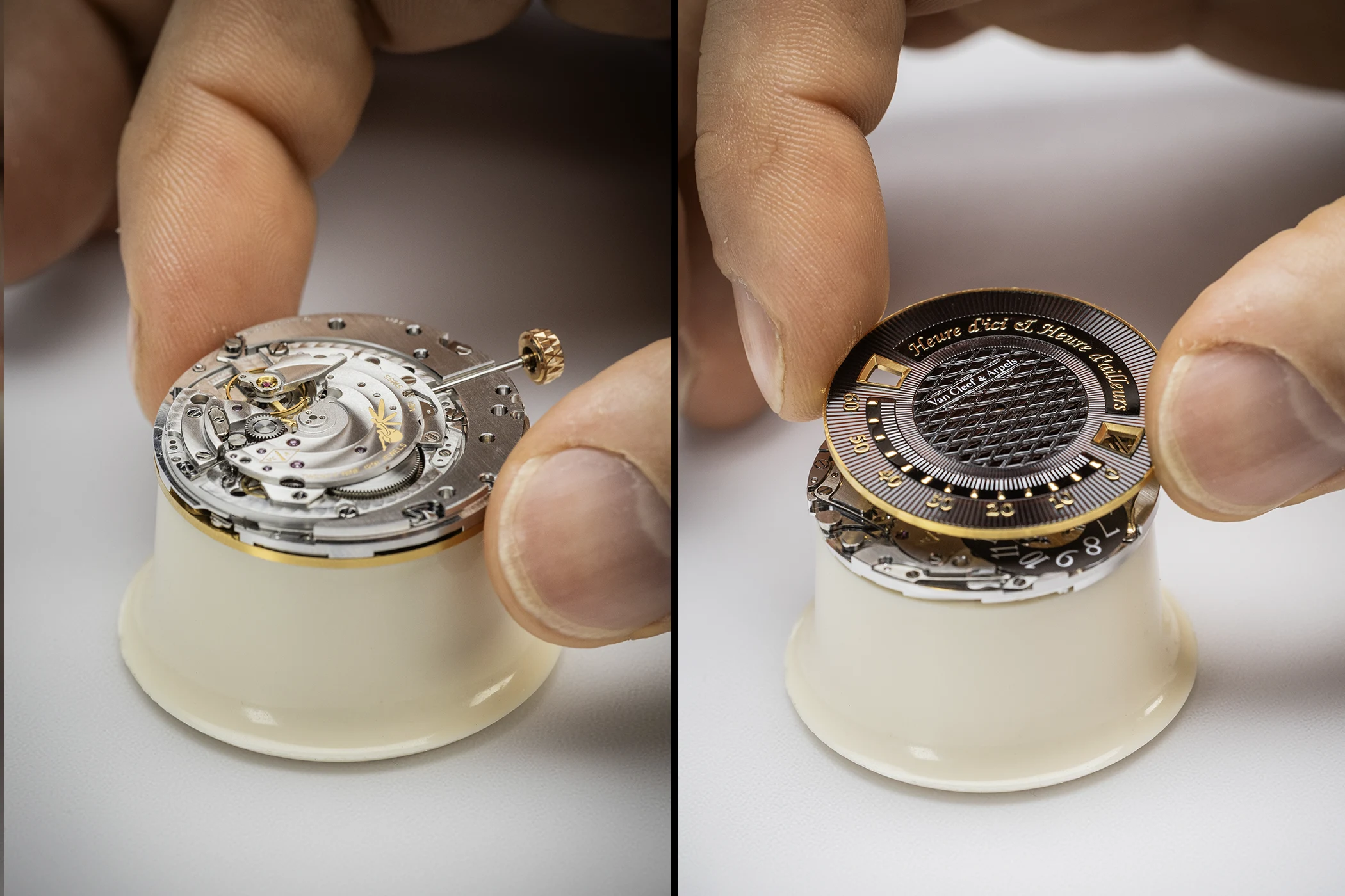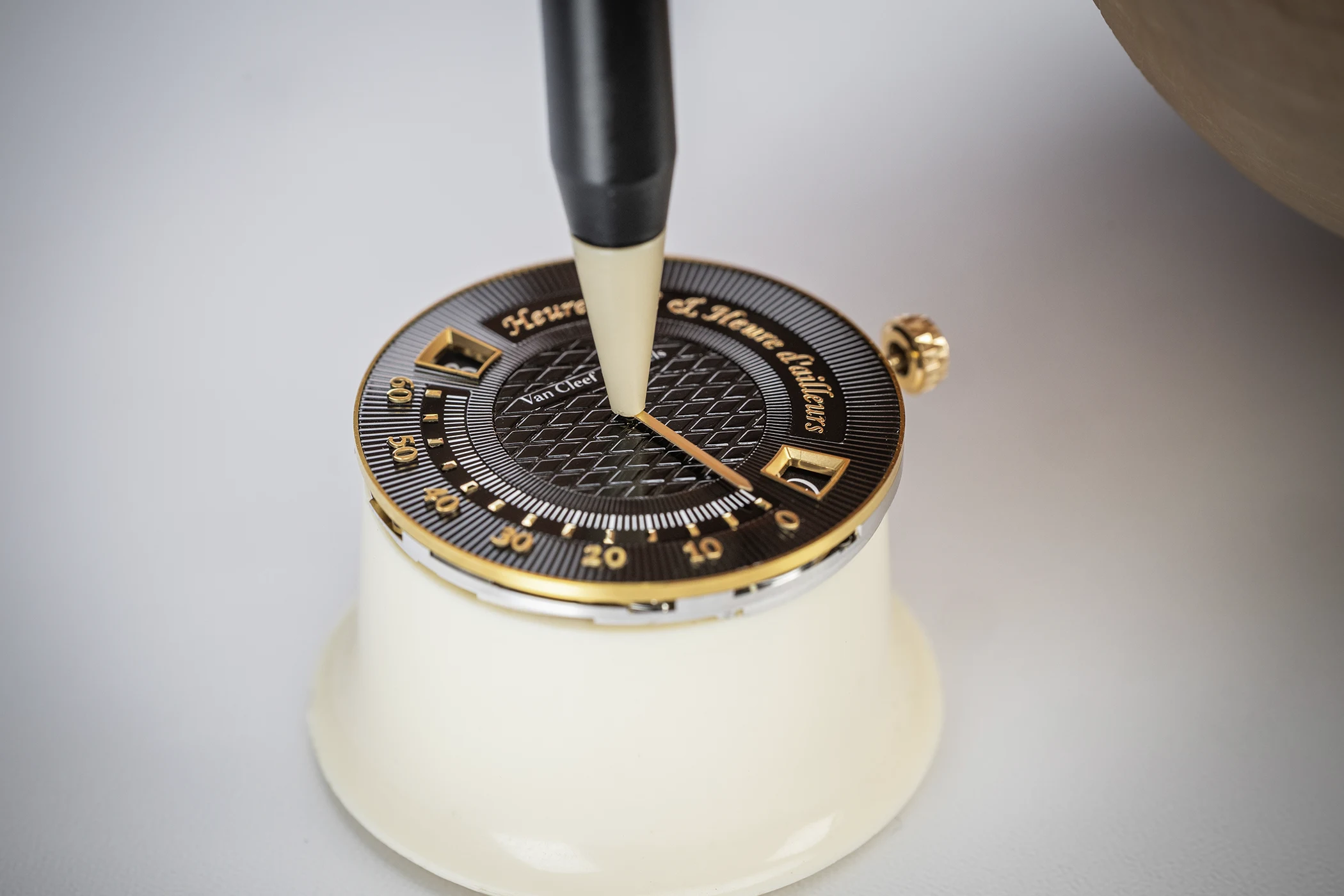 To create the dial, Van Cleef & Arpels enlisted the expertise of a Geneva-based atelier. The desired shade was entirely new to the Maison’s palette: a warm colour with cool undertones reminiscent of certain gemstones. After extensive testing, they achieved a distinctive amber-brown tone whose nuances shift with the light. The dial’s radiance is further enhanced by a mirror-polished gold base that reflects light back through the enamel.