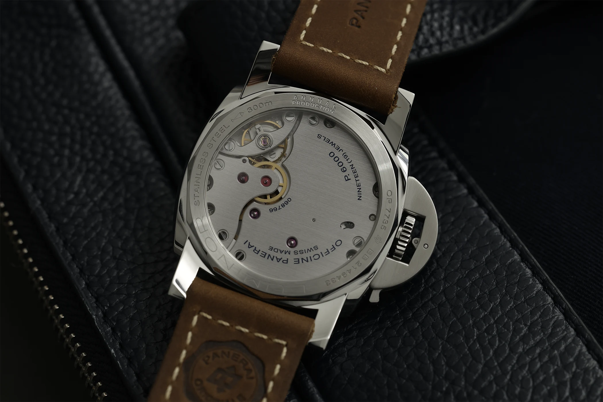 This is most clearly demonstrated by the two P.6000 models. The P.6000 calibre is a hand-wound movement measuring 15½ lignes, 4.5 mm in height, with 19 jewels, 21,600 vibrations per hour, Incabloc shock protection, a barrel, and 110 individual components. The movement is decorated with blue lettering and horizontally brushed surfaces and is visible through the open caseback, which is often a decisive factor for many Paneristi when making a purchase. However, it is ultimately the displays that catch our eye and set the two models apart.