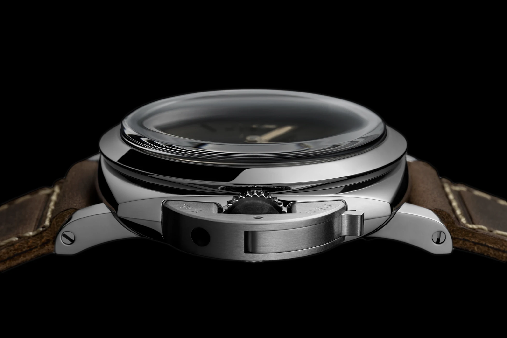 This is most clearly demonstrated by the two P.6000 models. The P.6000 calibre is a hand-wound movement measuring 15½ lignes, 4.5 mm in height, with 19 jewels, 21,600 vibrations per hour, Incabloc shock protection, a barrel, and 110 individual components. The movement is decorated with blue lettering and horizontally brushed surfaces and is visible through the open caseback, which is often a decisive factor for many Paneristi when making a purchase. However, it is ultimately the displays that catch our eye and set the two models apart.