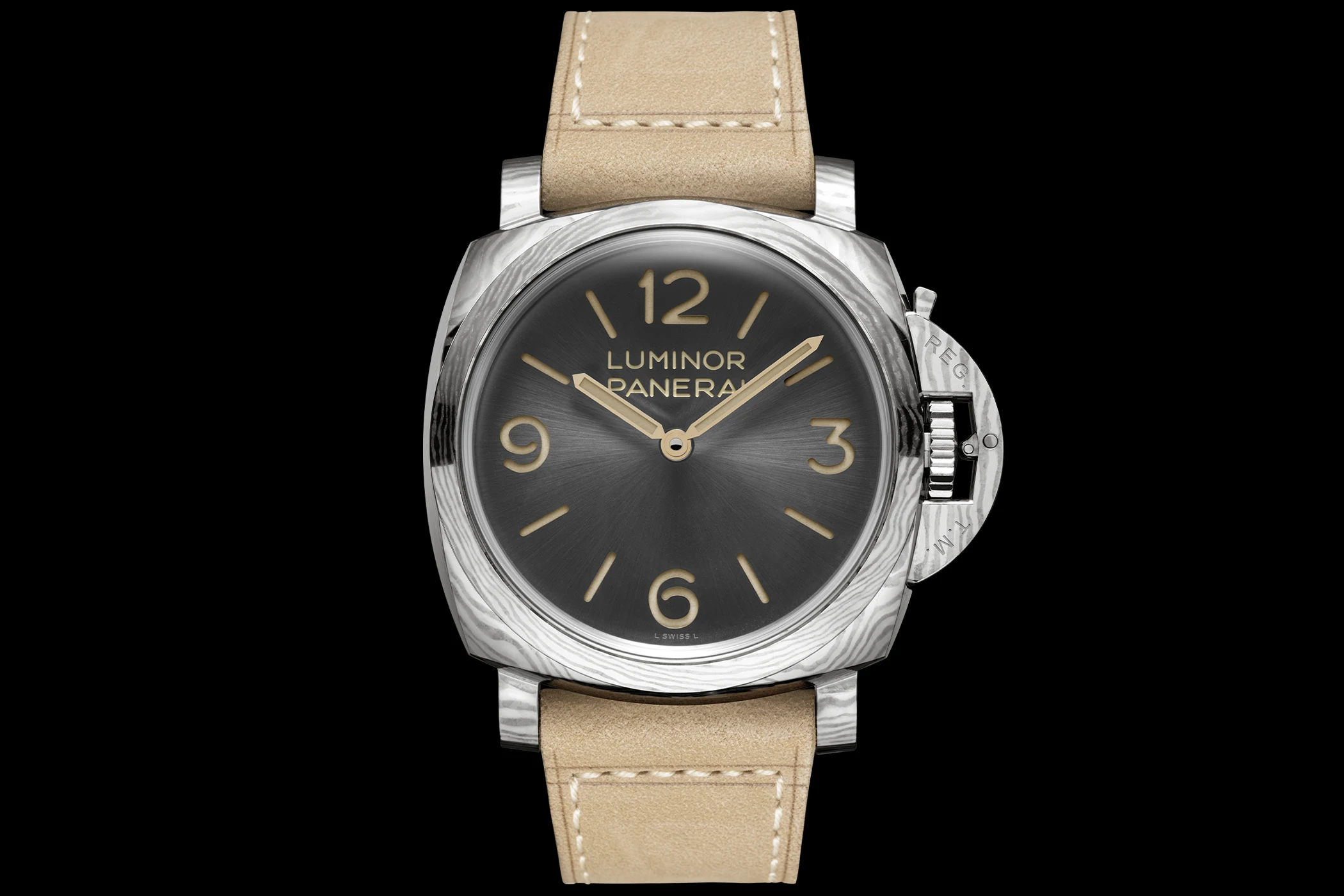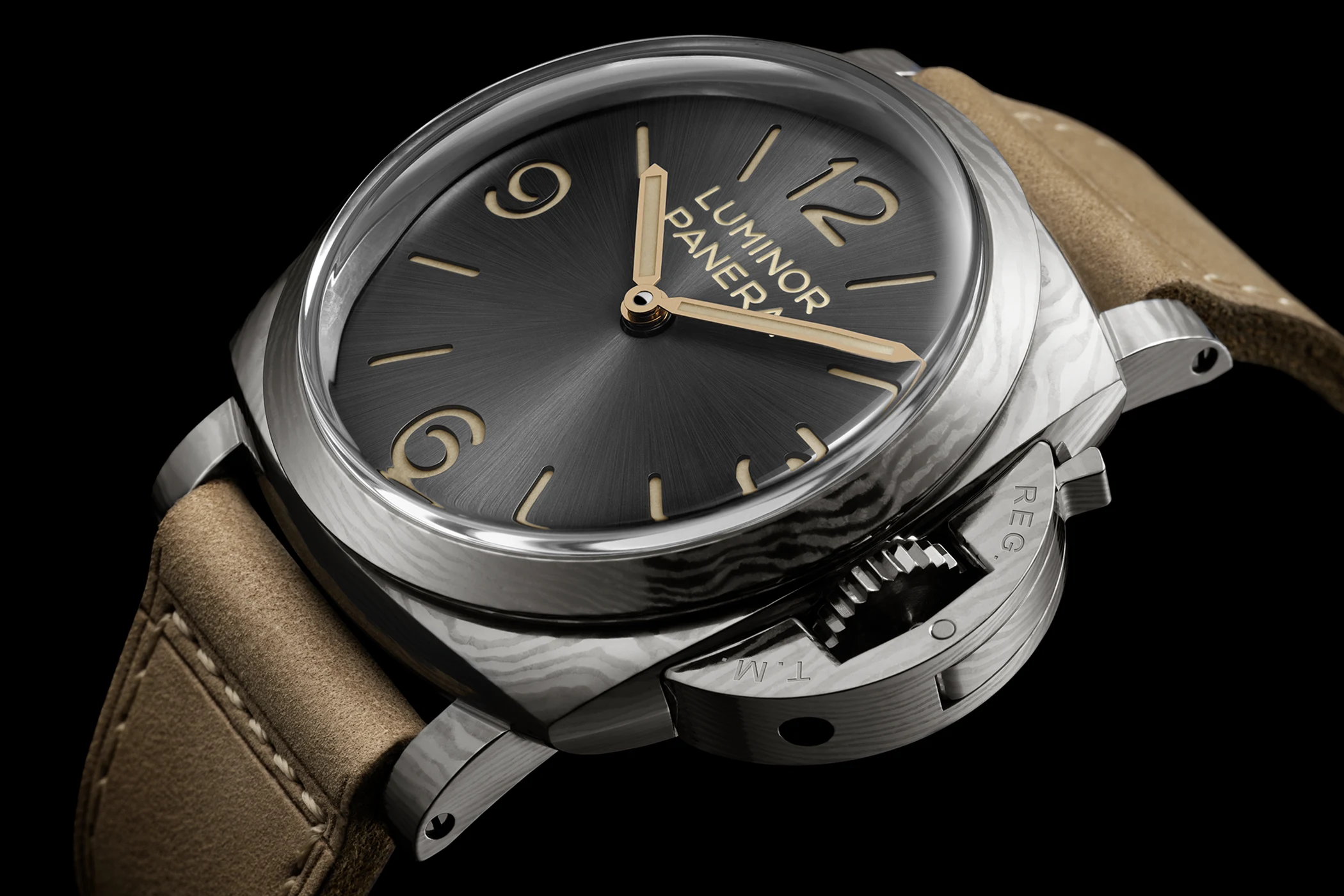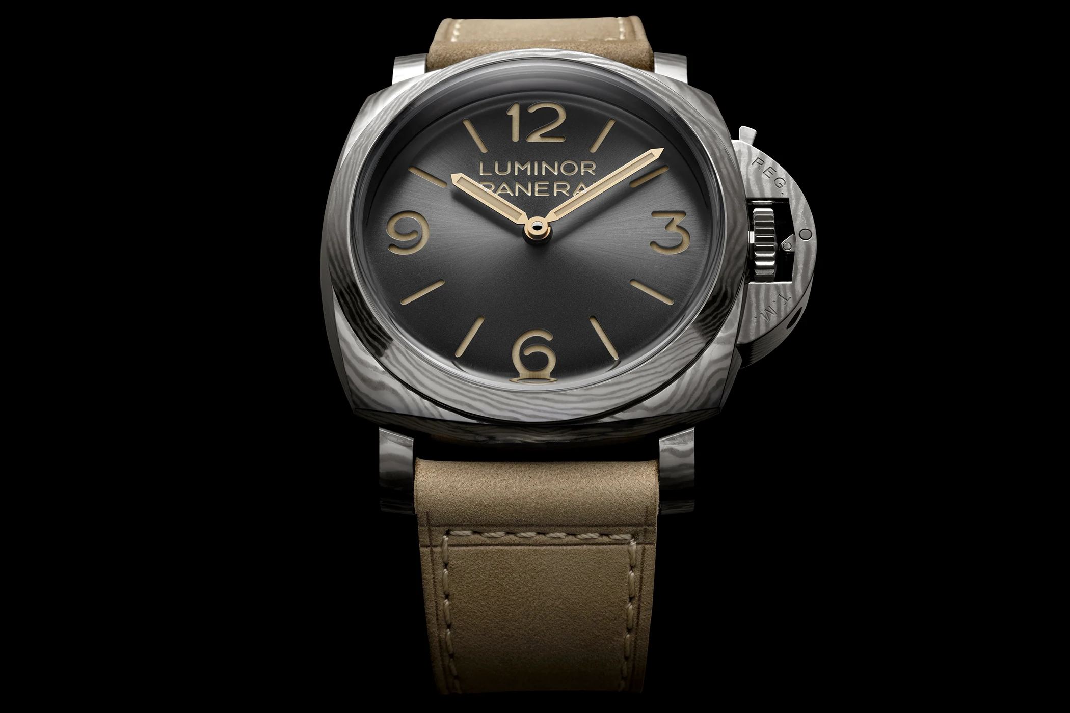 The wave-like texture of the forged titanium makes every case unique. This is complemented by the anthracite-coloured sunburst sandwich dial, featuring beige Super-LumiNova and historically inspired hands. This model is also water-resistant to 10 bar, or approximately 100 metres. It comes with a light beige suede calfskin strap, a black rubber strap, a blue cherry wood box and a screwdriver. The PAM01629 is limited to 100 pieces.