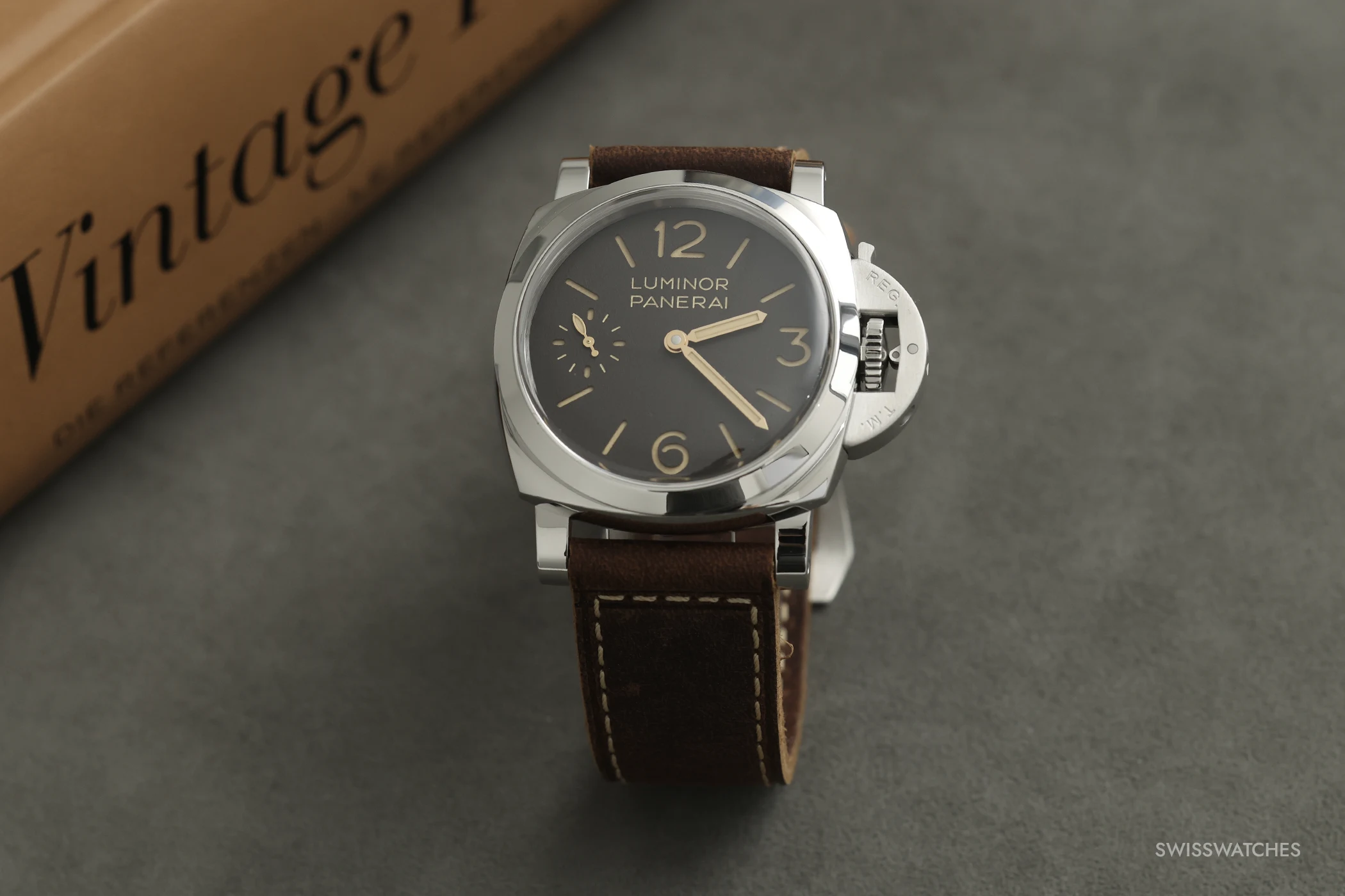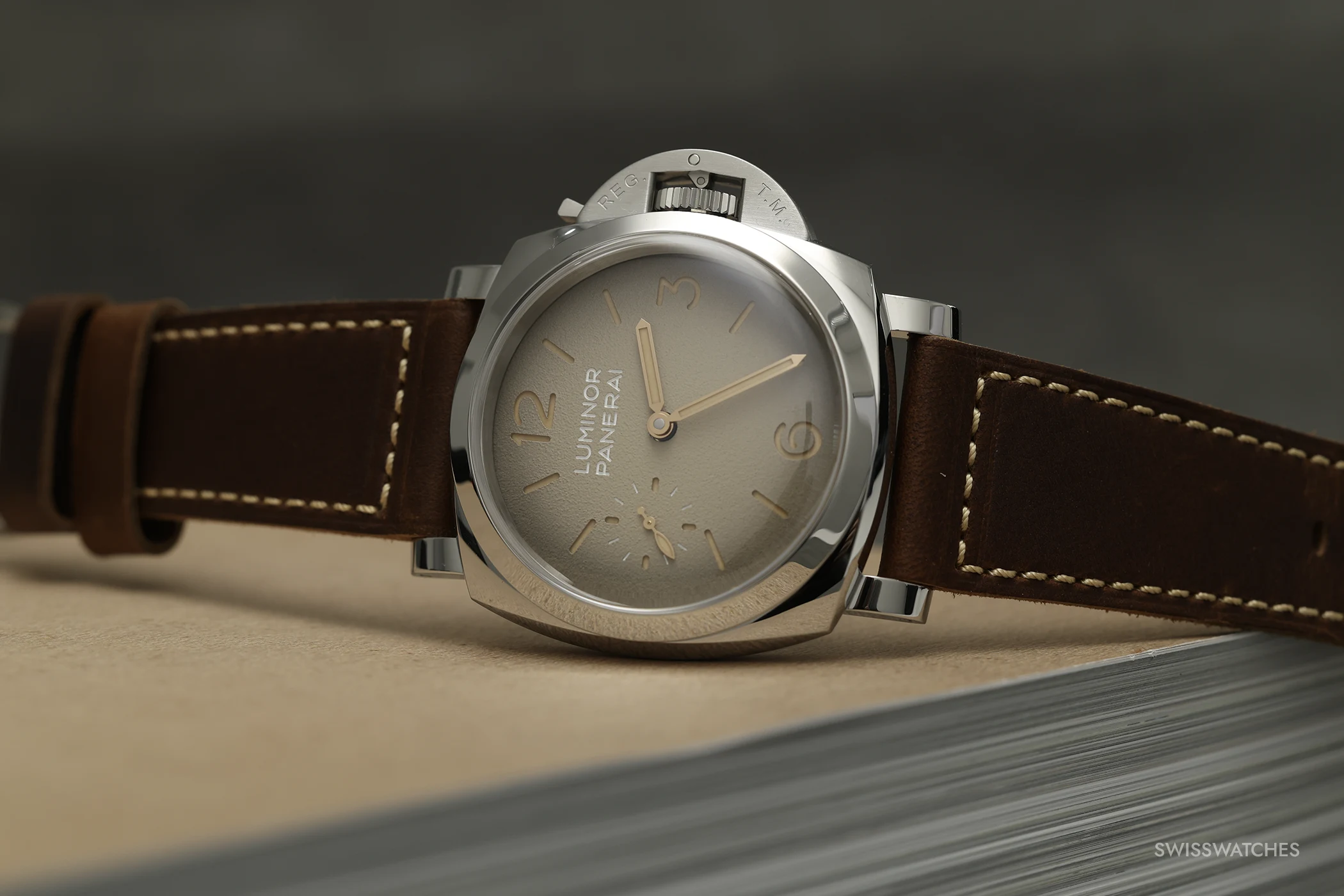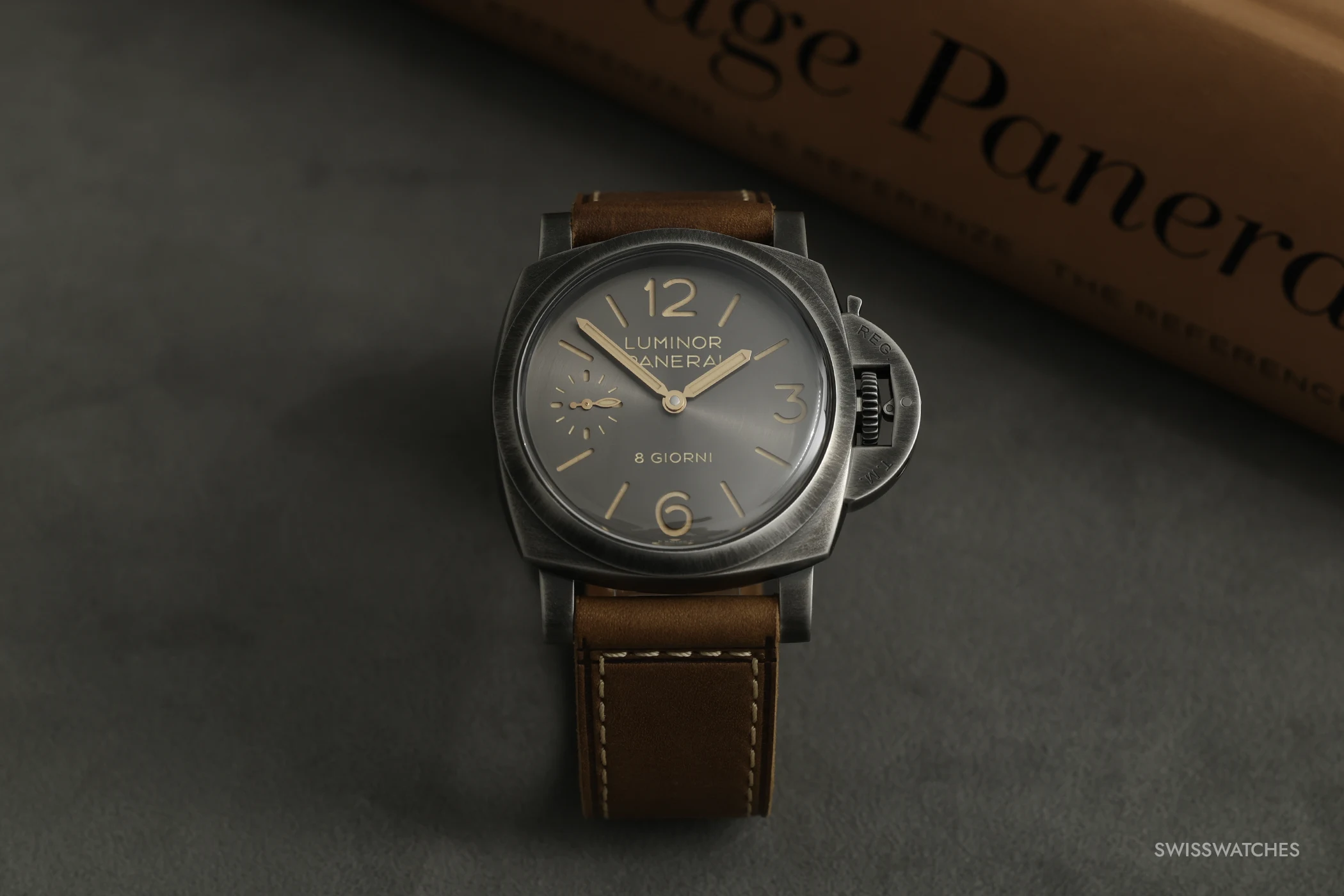 The wave-like texture of the forged titanium makes every case unique. This is complemented by the anthracite-coloured sunburst sandwich dial, featuring beige Super-LumiNova and historically inspired hands. This model is also water-resistant to 10 bar, or approximately 100 metres. It comes with a light beige suede calfskin strap, a black rubber strap, a blue cherry wood box and a screwdriver. The PAM01629 is limited to 100 pieces.