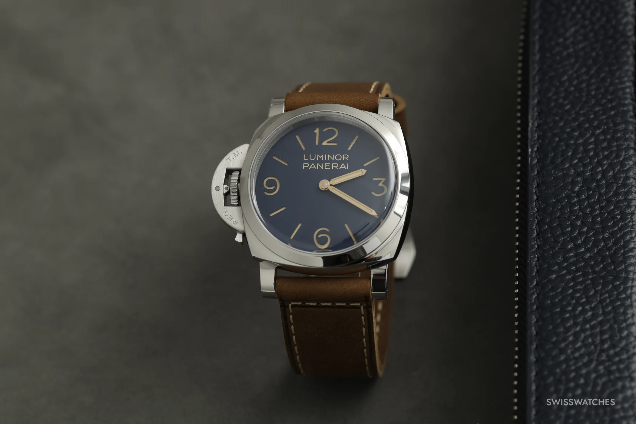 Unlike the Luminor PAM01731, the Luminor Destro PAM01732 is its more distinctive sister model, primarily due to its construction. At Panerai, ‘Destro’ means that the crown protection bridge is located on the left side of the case, at 9 o’clock. Historically, this was intended as a solution for wearing the watch on the right wrist, with the original aim of maintaining the mobility of the other hand during operations. The dial of the Luminor Destro is matt, grainy, and blue (‘matte grainy blue’), also constructed as a sandwich, again with beige Super-LumiNova and double pencil hands. Unlike the PAM01731, however, there is no small seconds dial on the left, so despite the identical base calibre, the functions are officially only hours and minutes. Panerai opts for a refreshed strap palette, combining light brown calfskin with beige stitching and a blue rubber alternative, each with a trapezoidal clasp; as with the PAM01731, the set also includes a screwdriver..