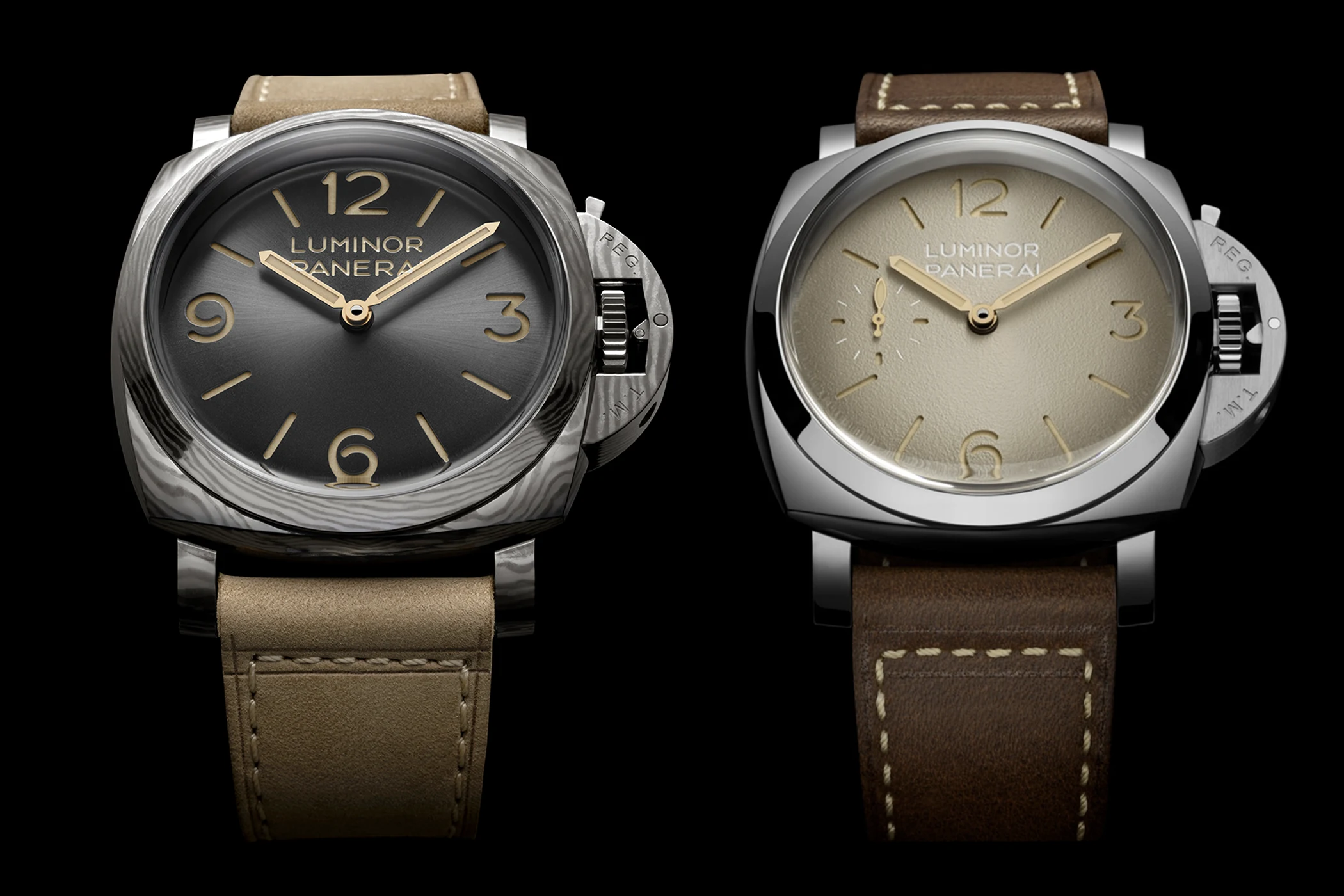 What all five models have in common, above all, is their historical connection to the Luminor DNA: for the PAM01731, PAM01732 and PAM01733, a new 44-millimetre case shape inspired by the historic Luminor Ref. 6152/1 from the 1950s, but deliberately adapted for the modern era. For the two models PAM01731 and PAM01732, the brand has also drawn inspiration from a more recent reference, the PAM00372 from 2011 – one might think of it as a “contemporary interpretation” of the classic Luminor concept. The cushion-shaped silhouette, the crown guard and the slightly domed sapphire crystal – which echoes the look of earlier plexiglass models – remain characteristic features. The PAM01735 and PAM01629, on the other hand, take this concept further with a larger 47-millimetre case and draw even more closely on the design language of the Luminor models from the 1960s – including a cushion-shaped middle section, a flat crown guard, domed sapphire crystal and an overall look that is deliberately vintage-inspired.