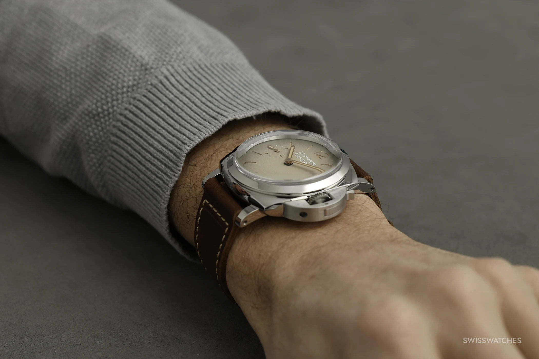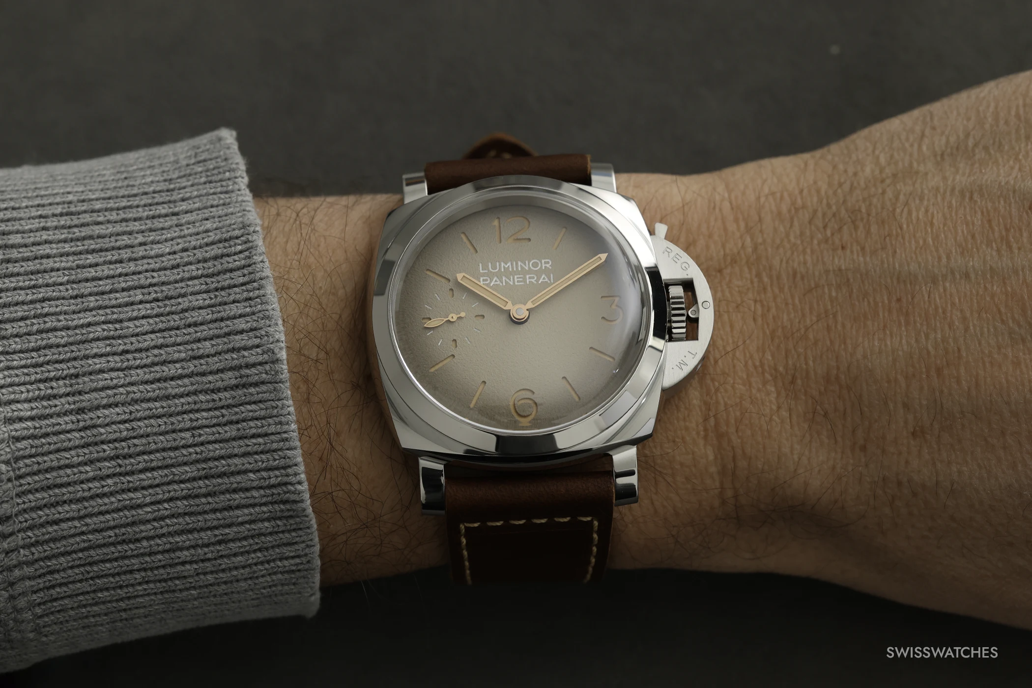 The Luminor PAM01735 is the more classic interpretation of the duo. The case and bezel are crafted from polished steel, whilst the crown guard is satin-finished. Its grained, matt sandwich dial with an ivory-coloured gradient is reminiscent of historic ‘tropical dials’, whose colour has changed over the years due to light and ageing.