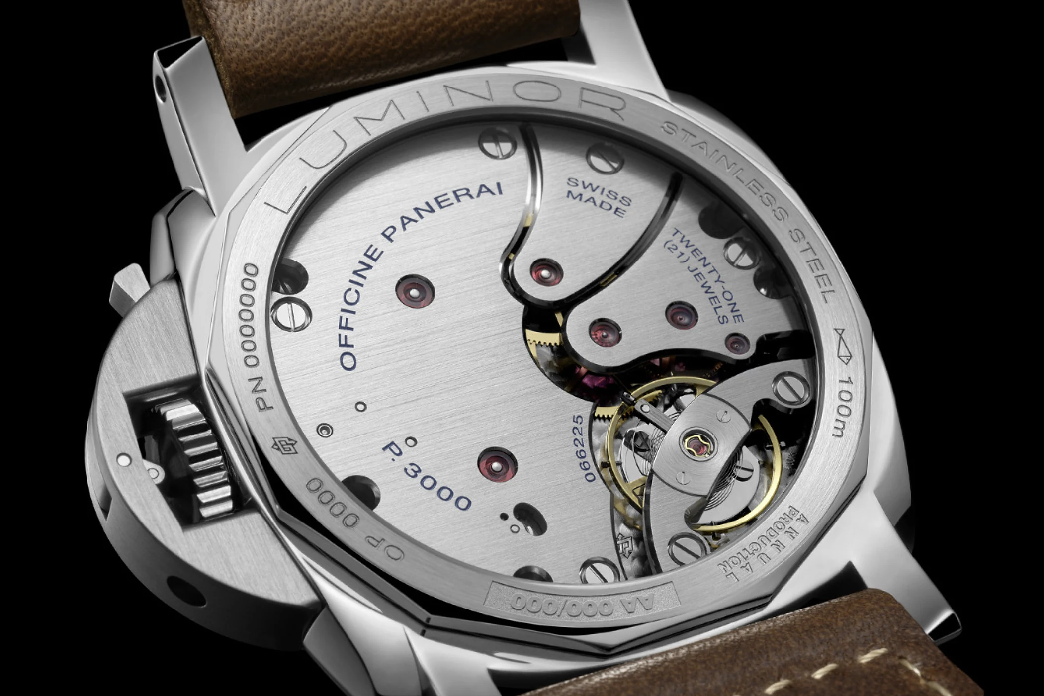 Inside each watch beats Panerai’s hand-wound caliber P.3000, which was first introduced in 2011 in the 47 mm case of the Luminor PAM00372. At 16.5 lignes, it is deliberately large and fills the case appropriately, rather than appearing like a small movement in a large watch case. Its 5.3 mm height, Glucydur balance wheel, 21 jewels, and frequency of 21,600 vibrations per hour underscore its robust, functional character. Together with Incabloc shock protection, two mainspring barrels, 160 components, and a three-day power reserve, both references feature a movement designed less for decorative complexity and more for reliability, stability, and long-lasting performance.