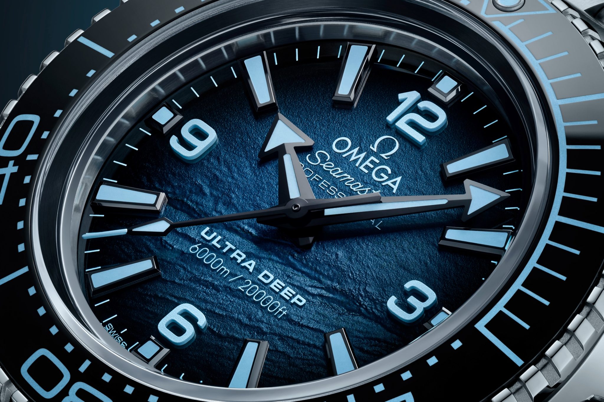 Going even deeper into the depths of the oceans is the Omega Planet Ocean Ultra Deep with its whopping 6,000 metres of water resistance, as a tribute to the world record dive of 2019. With this watch, you could indeed easily dive to the deepest point of the Mediterranean, which is not far from Mykonos at all. The so-called Calypso shallow, which reaches 5,267 metres, is just a few nautical miles away. This watch celebrates the explorer and scientist Victor Lance Vescovo (here’s our in-depth interview with him) who, since 2019, not only holds the world record for reaching the deepest point on earth with his 10,935 metres. A true adventurer of the modern age who, as a scientist, deserved at least one watch as a dedication, is paid tribute to with the Ultra Deep – and very charmingly at that. The 45.5 mm model has a case and bracelet also made of O-MEGASTEEL and a very unusual dial: it shows the above-mentioned Challenger depth in an elaborately printed 3D relief, which was translated into this dial structure by means of over one million topography points. The watch is only blue in parts, and towards the edge turns black, with a black lacquered dial and bezel, which in turn has Super-LumiNova inserts in light blue. Inside, of course, ticks Omega’s 8912 calibre, the same one that powers the Ploprof. Omega could not resist a charming gimmick, which only becomes clear under water or UV light: on the dial, as if handwritten in Super-LumiNova, are the words ‘OMEGA WAS HERE!’ in violet, referring to the world record dive of 10,935 metres and showing the outlines of the western, central and eastern basins with a tiny Omega logo in the middle.