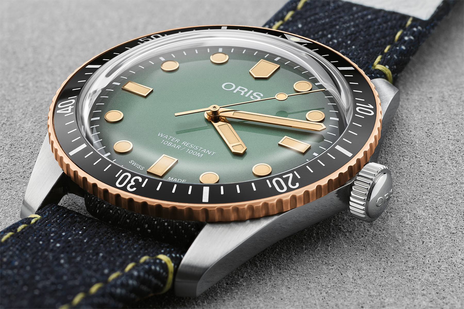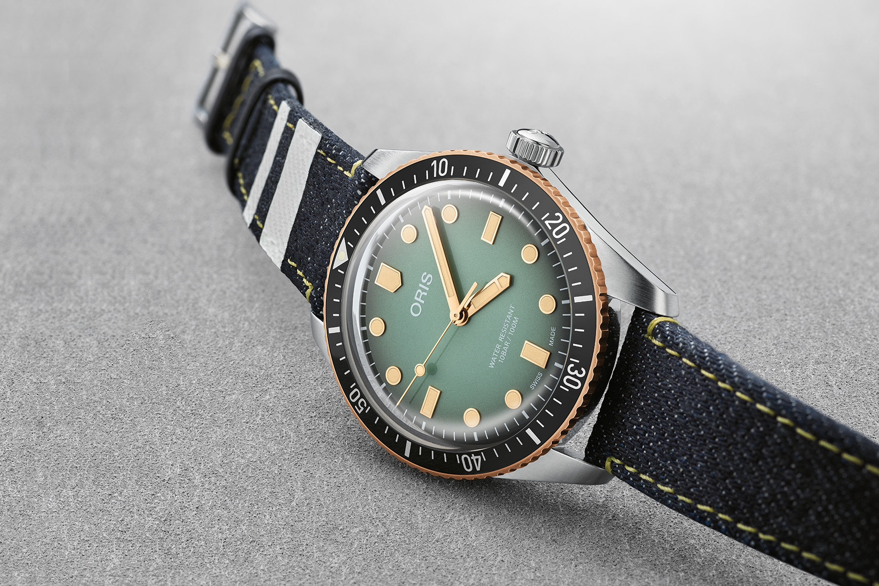 The Swiss watch company Oris pairs up with the independent Japanese brand Momotaro Jeans. From this collaboration, a special steel and bronze version of the Oris Divers Sixty-Five emerged, with an indigo blue Momotaro denim strap with two white ‘battle stripes’, the denim manufacture’s signature.