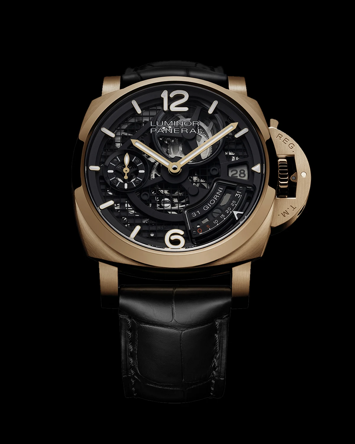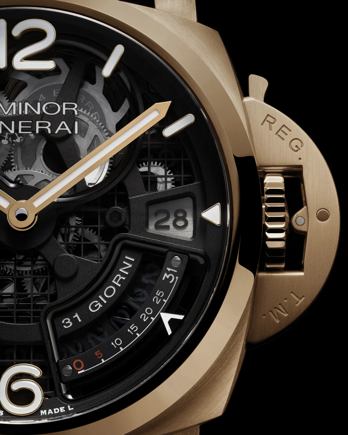 Visually, the watch remains clearly recognisable as a Panerai. The 44-millimetre Luminor is crafted from Panerai’s renowned Goldtech alloy, a proprietary blend of gold, copper, platinum, and silver. This gives the case its warm, reddish hue. Added to this is an open dial that reveals parts of the movement without detracting from the classic Luminor aesthetic. The skeletonised construction, curved power reserve indicator and polarised date display at 3 o’clock give the watch depth without making it appear overloaded. For readability, Panerai uses white Super-LumiNova X2 on the hands and indices.