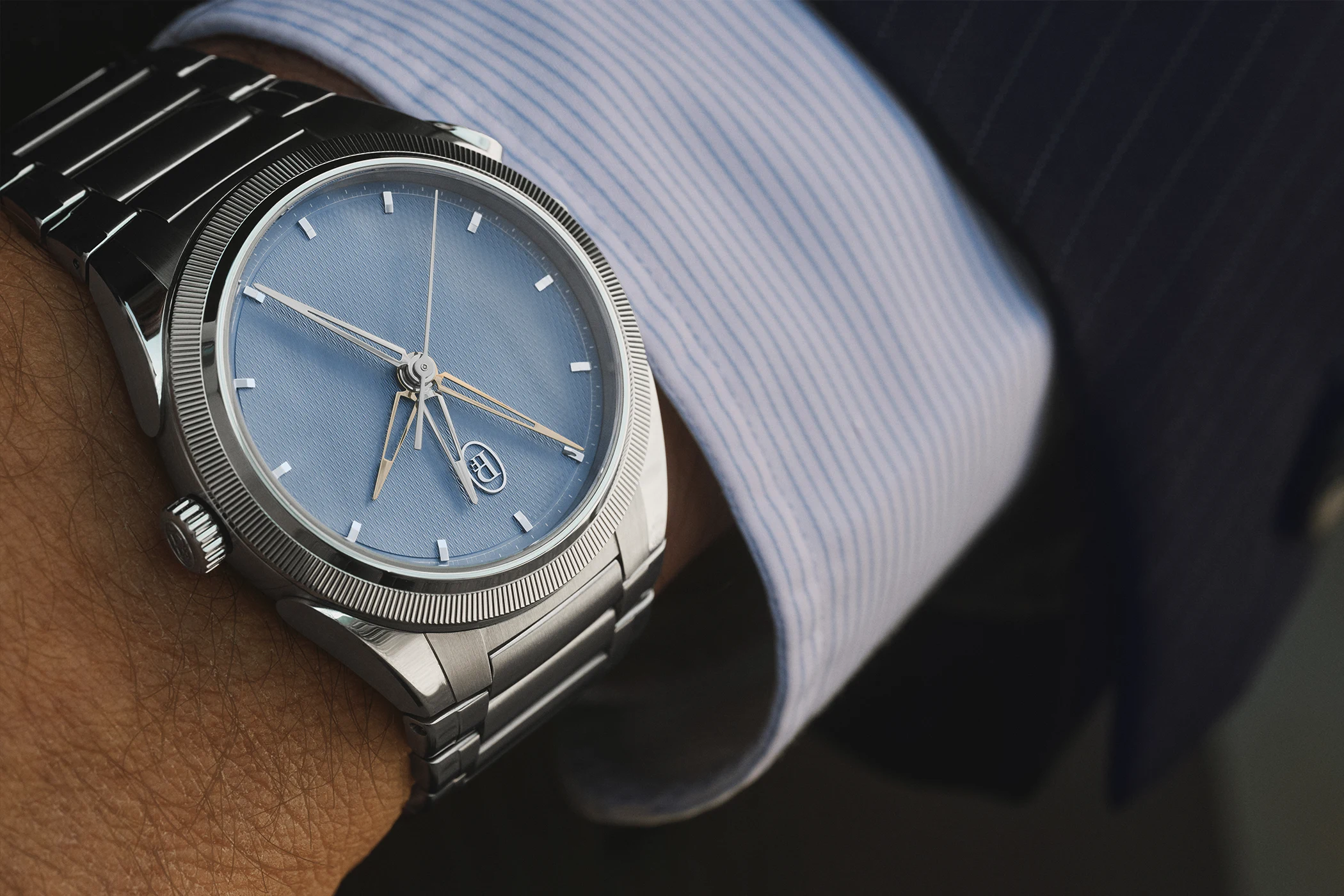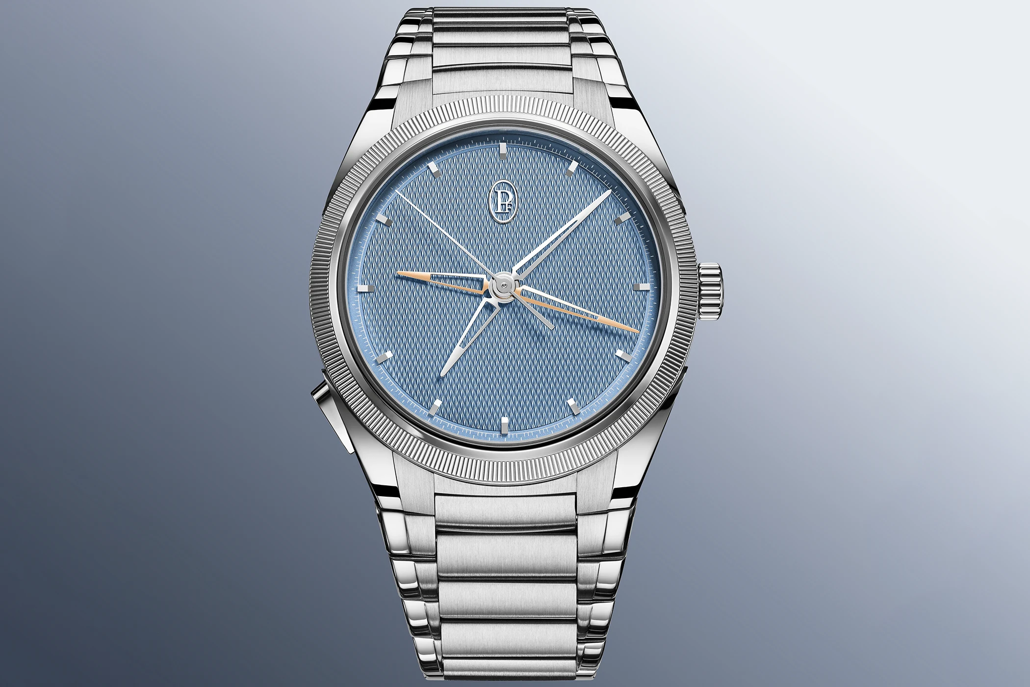 The 40-millimetre-wide and 13-millimetre-high stainless steel case features the timeless architectural lines of the Tonda PF. The knurled platinum bezel frames the dial, whilst the integrated steel bracelet tapers organically and the teardrop-shaped push-piece harmonises with the design of the lugs.