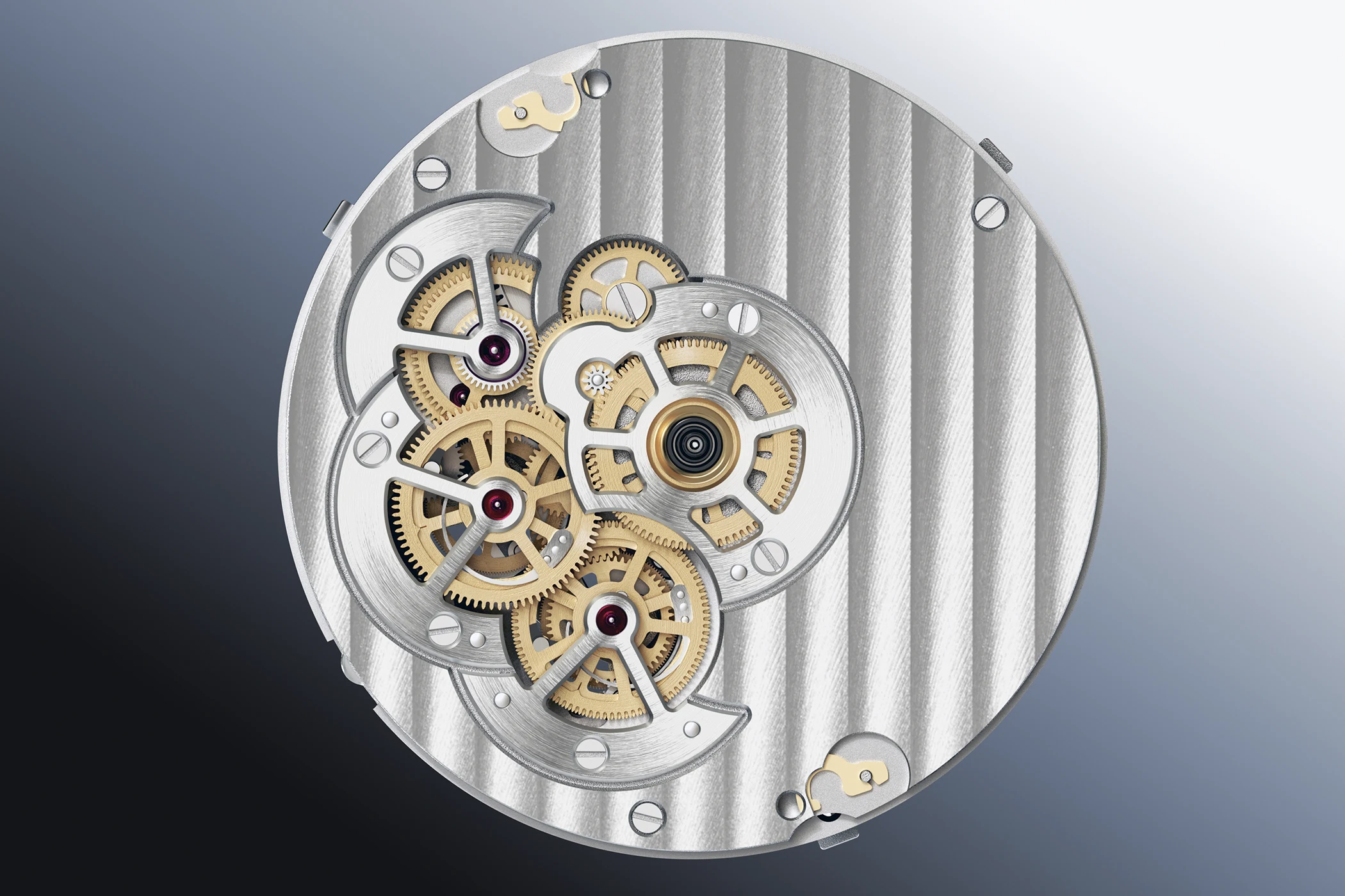 The fact that all five hands are aligned on a single axis further complicates matters. Furthermore, the watchmakers had to develop a new gear train control mechanism for the single-push-button chronograph, as it essentially starts with a flyback function, stops normally when the button is pressed a second time, and activates the double rattrapante function when pressed a third time.