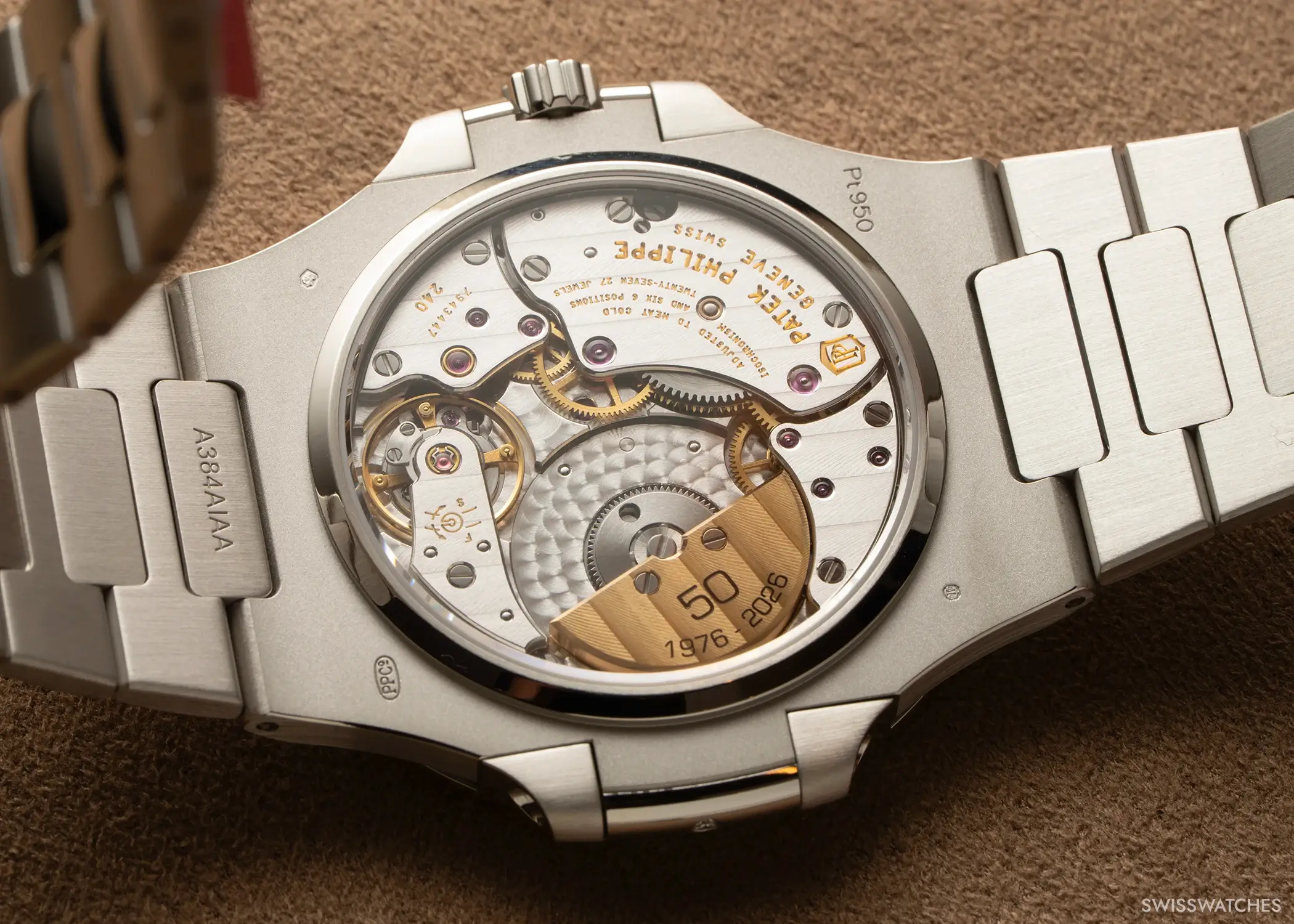 All three anniversary versions of the Patek Philippe Nautilus are powered by the well-established ultra-thin calibre 240, which dates back to 1977 and has been driving the brand’s high-end automatic watches for over 60 years. Like many movements from the 1970s, the Cal. 240 operates at a relatively measured frequency of 21,600 vibrations per hour (3 Hz), contributing to a power reserve of minimum 48 hours, while requiring careful regulation to maintain precision. This is ensured by Patek Philippe’s Gyromax balance, which features four internal weights for fine adjustment. In order to keep the movement as slim as possible—comprising 152 individual components—the calibre 240 uses a 22-carat gold micro-rotor for automatic winding, which, in these special editions, is engraved with the inscription “50 1976–2026” in reference to the anniversary. In keeping with its ultra-thin construction, the calibre 240 also dispenses with a seconds hand. With a height of just 2.53 mm and a diameter of 27.5 mm, the movement continues to serve as a platform for numerous complications within Patek Philippe’s range of slim watches.