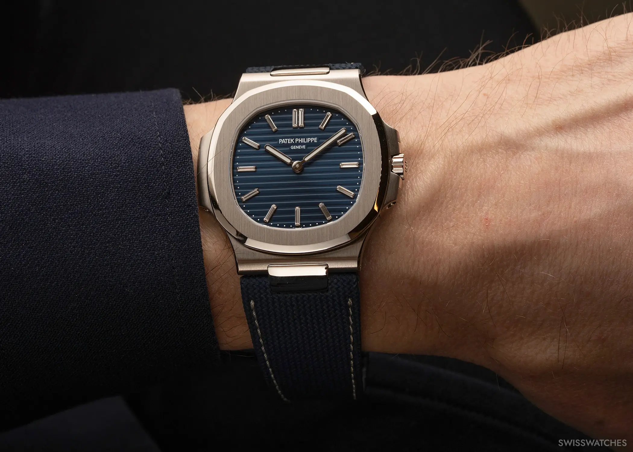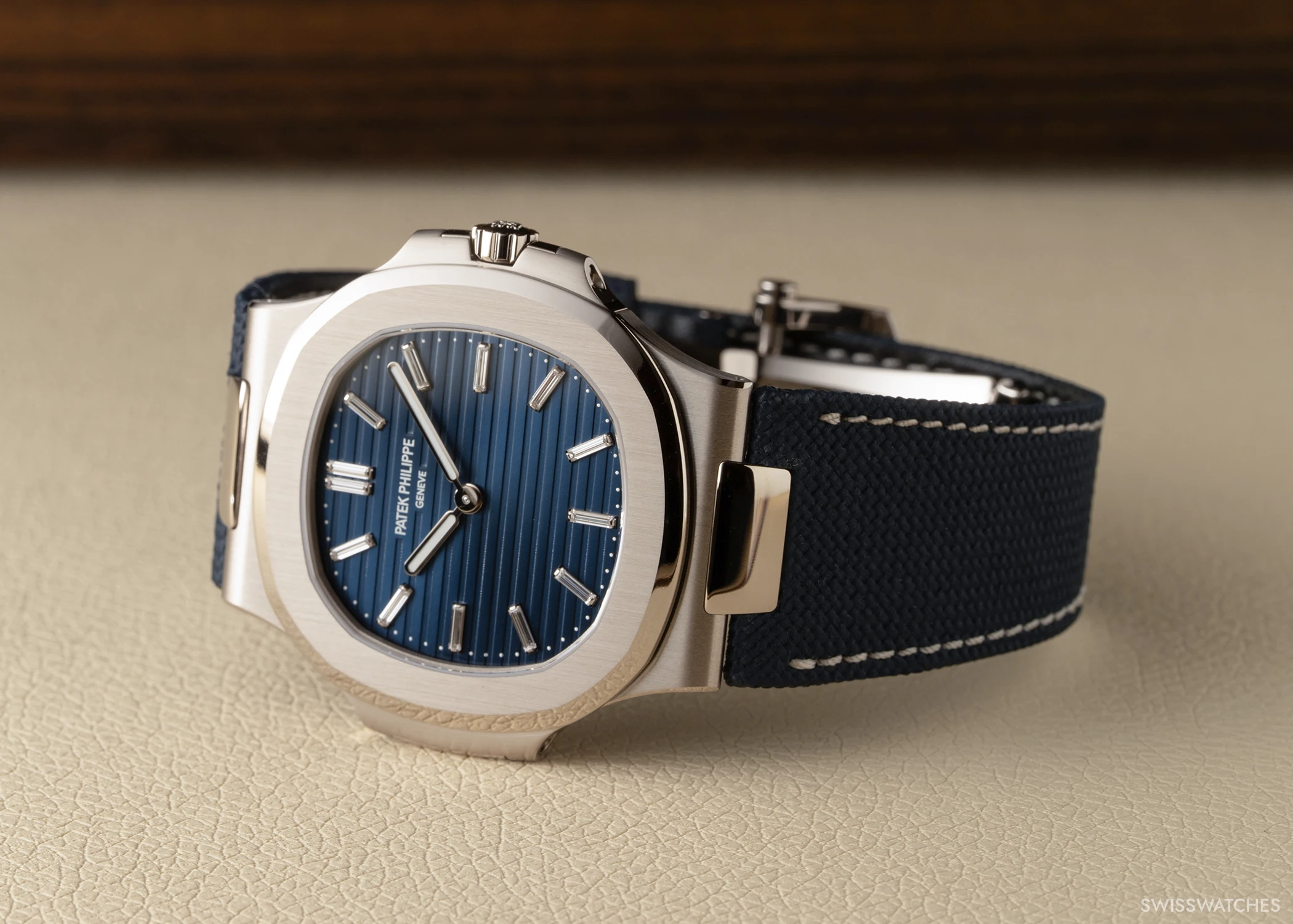 Its case preserves the characteristic design language of the Nautilus, defined by the porthole-inspired construction reminiscent of steamship windows and the rounded octagonal bezel. The two-part white gold case measures 50.65 mm in diameter and 13.5 mm in height, and features a sapphire crystal caseback protected by a blue hinged cover adorned with a hand-engraved Calatrava cross. Opening the hinged cover reveals the inscription “50th Anniversary Nautilus 1976–2026 Patek Philippe” on the caseback. Interestingly, in reference to historical pocket watches, the case also features a suspension bow at 12 o’clock, although it is not accompanied by a chain.