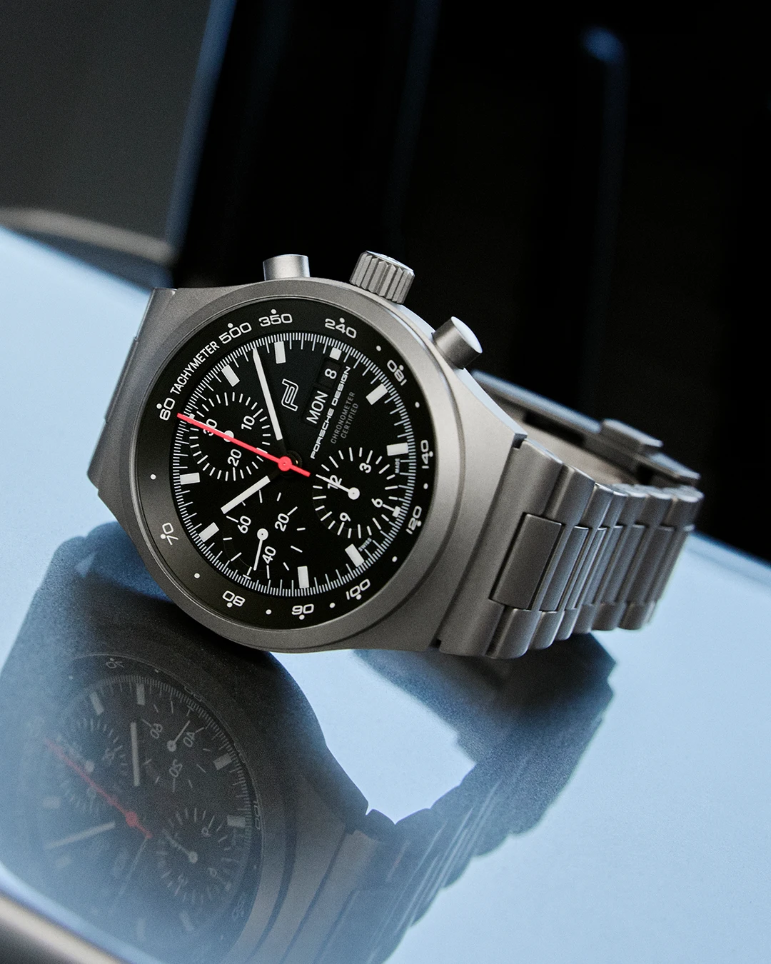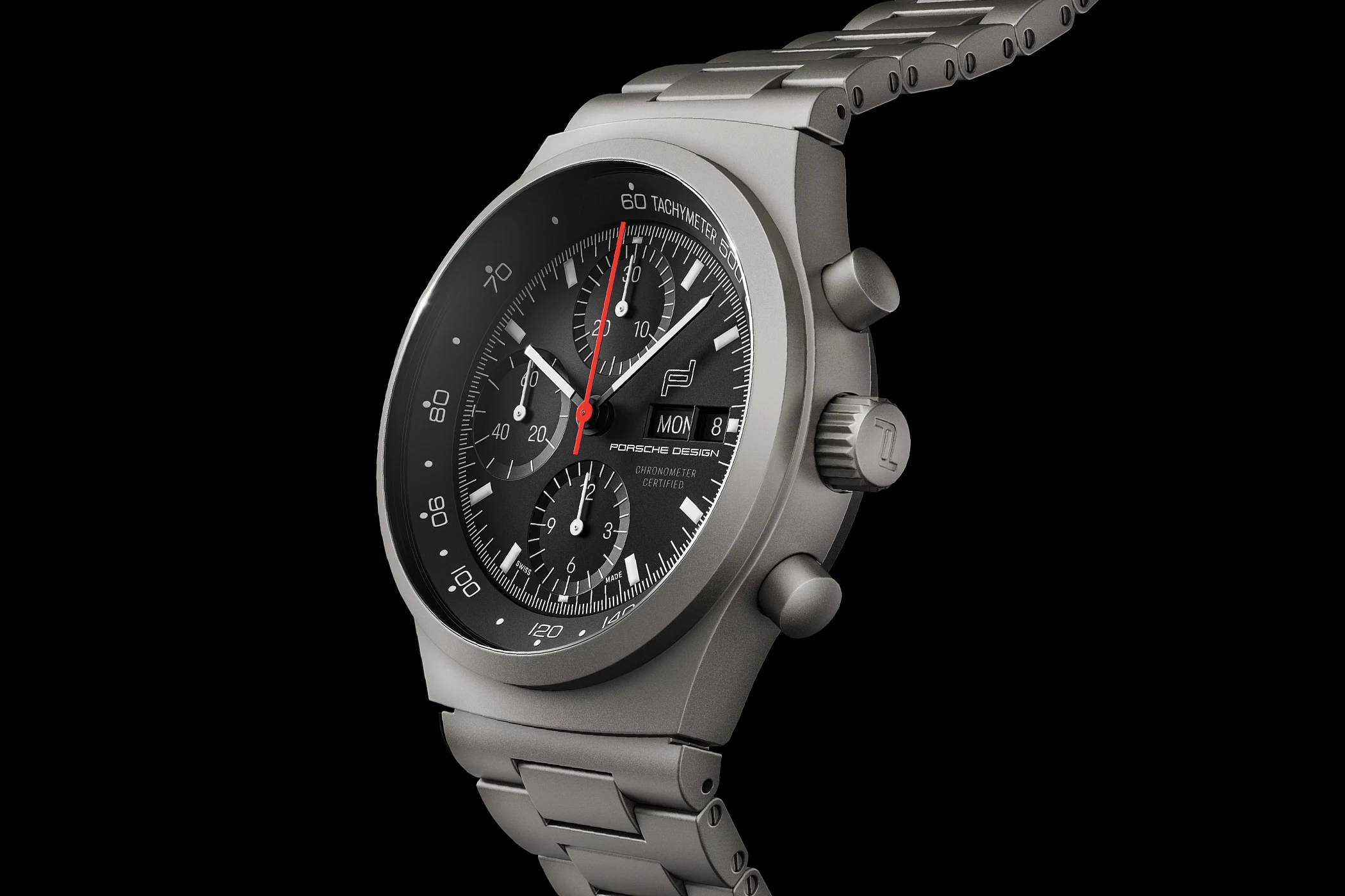 This was remarkable in that black had previously appeared in watchmaking primarily on dials and bezels, but not as the colour of cases and bracelets. The matte black characteristics of the dial, case, bezel and bracelet collectively evoked the glare-free instrument panel of a Porsche 911, while their uniform black aesthetic prevented reflections. With these features, the Chronograph 1 became the first entirely black wristwatch ever created.