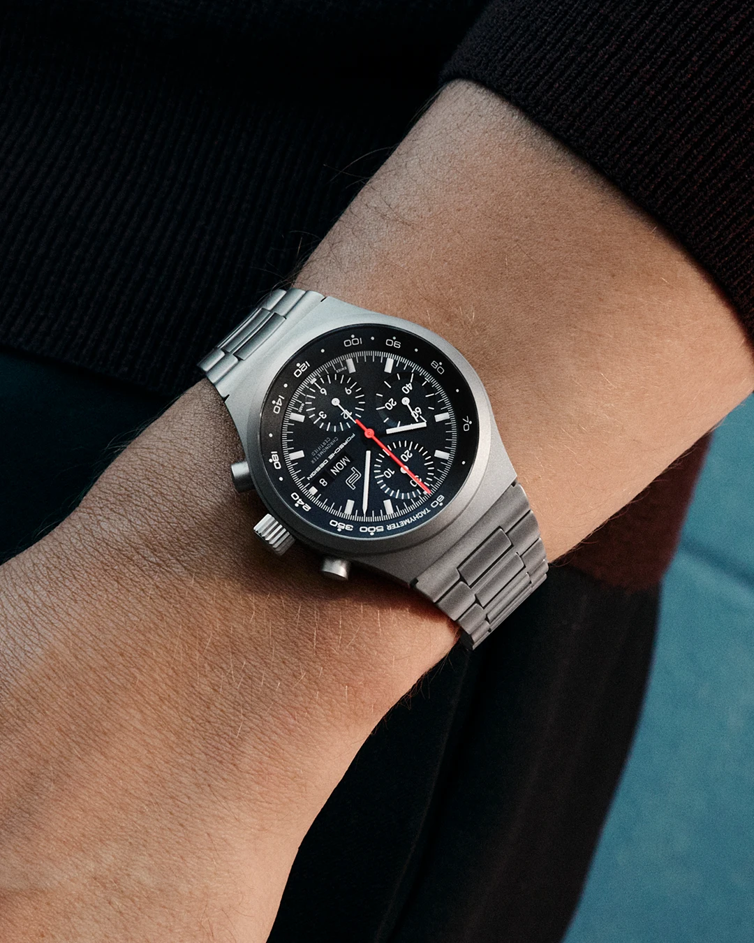 To achieve this, he created a watch defined solely by the principle that its form and construction should arise from function, transferring the design philosophy of the 911 sports car to the Chronograph 1 — and thus to the wrist. The design in particular was inspired by the black instrument panel of the 911: the most prominent expression of these principles is the dial, featuring a red central chronograph seconds hand, a 30-minute counter at 12 o’clock, a 12-hour counter at six o’clock, the rehaut with its tachymeter scale, and white numerals and indices that stand out in sharp contrast against the black dial. Alongside the dial and the rehaut, the case, bezel and bracelet — also executed entirely in black — were themselves regarded as a further expression of this design principle.