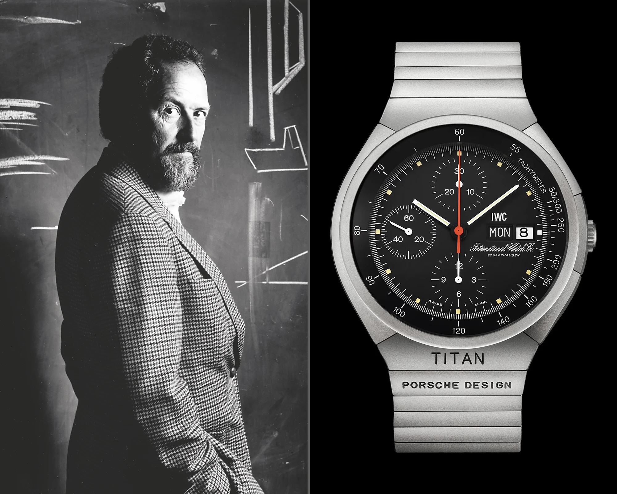 Based on the material expertise gained from this first project, a second titanium timepiece followed in 1981 at the Basel Watch Fair: the IWC Porsche Design Titan Chronograph. With this watch, the concept of the Chronograph 1 originally designed by Ferdinand Alexander Porsche was further developed. The watch, which succeeded the original chronograph, was considered remarkable for several reasons. It combined the lightweight, saltwater-, acid- and perspiration-resistant material titanium with the design concept of the Chronograph 1. At the same time, this timepiece was not only regarded as the world’s first serially produced wristwatch to feature the combination of a titanium case, titanium bracelet and a mechanical chronograph, but also as the first production wristwatch to incorporate chronograph pushers fully integrated into the case. Their large contact surfaces made starting, stopping and resetting the chronograph significantly easier. Inside the comparatively large 42 mm titanium case for its time beat the automatic Valjoux 7750 calibre, measuring 30 millimetres in diameter and 7.9 millimetres in height — a movement that had already proven itself in the Chronograph 1.