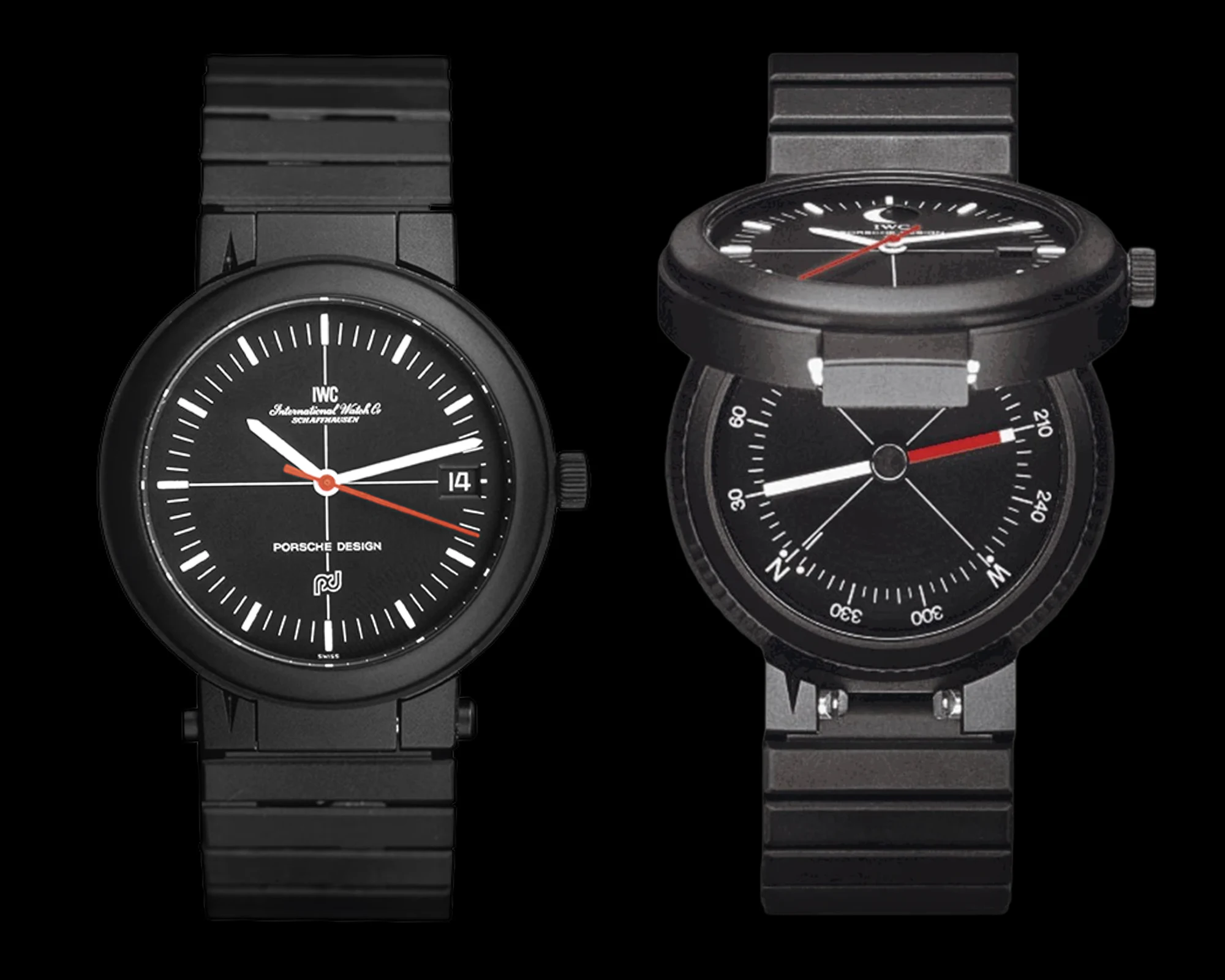 Yet the entirely black Chronograph 1 was not to remain the only milestone. In 1978, Porsche Design began a collaboration with IWC, which resulted in the IWC reference 3511 — a so-called compass watch that combined an anti-magnetic movement with a compass integrated into the hinged caseback. In addition, during this first joint project the partners also experimented with titanium as a material for the watch case — a metal that is difficult to machine but highly suitable for use in watchmaking.