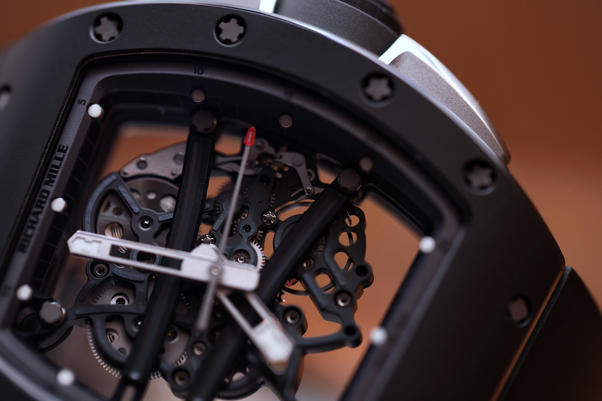 The bezel and caseback of the Yohan Blake All Grey are made of a special TPZ black ceramic. A material, that due to its low density allows a high resistance and a low thermal conductivity. That means, that it can also withstand very high temperatures. It’s made to 95% from Zirconium. The caseband is in NTPT carbon – a material that is exclusively used at Richard Mille. It consists of over 600 layers of carbon fibres that are glued together. Sounds a lot, but it weights nearly nothing. And it is almost not possible to get any scratches into it.