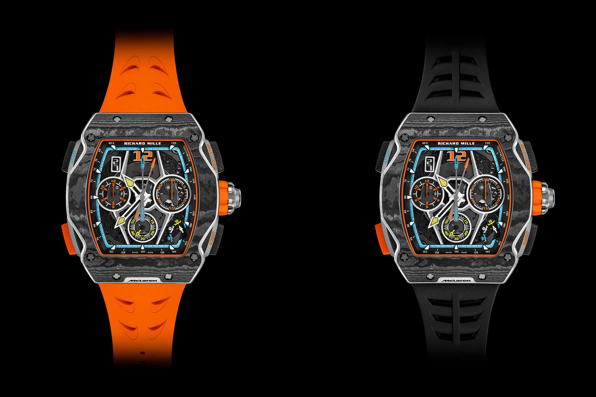 At the heart of the RM 65-01 McLaren W1 lies the RMAC4 movement, Richard Mille’s most advanced automatic chronograph calibre. Operating at a frequency of 36,000 vibrations per hour (5Hz), it can measure times with a precision of one tenth of a second. The vertical clutch and three column wheels ensure smooth activation of the chronograph functions, which include a split-seconds function that allows for intermediate timing. The movement is mounted on chassis mounting rubbers instead of a traditional casing ring, enhancing shock resistance. A unique ‘rapid winding’ system, activated by an orange Quartz TPT pusher, allows the movement’s 60-hour power reserve to be fully recharged with just a few pushes. The variable geometry rotor can be adjusted to the wearer’s lifestyle, ensuring optimal winding. The grey electroplasma treatment of the titanium baseplate and the black PVD and grey electroplasma treated bridges add to the movement’s aesthetic appeal, visible through the caseback.