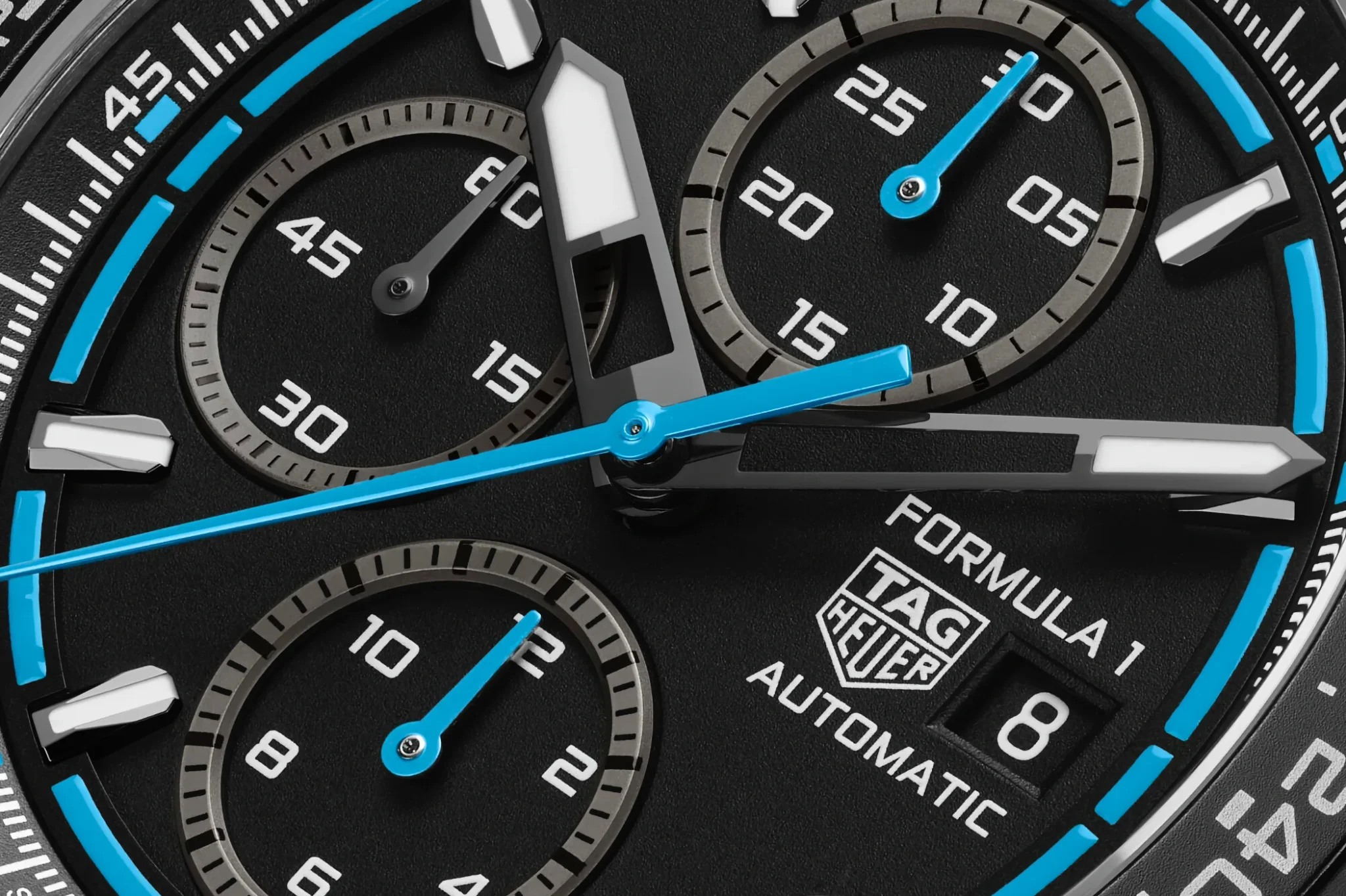 The dials of the TAG Heuer Formula 1 Chronograph models vary in colour but share a common design language. They feature a black opaline base with a track running around the dial, lacquered in colours that reflect the ‘Grand Prix by night’ theme which has been the inspiration for these watches. Each model has its own colour scheme: red, blue, or lime green. The counters are positioned at 12, 6, and 9 o’clock. The applied indices and hands are coated with Super-LumiNova, ensuring readability in low light conditions. There is also a date window at 3 o’clock. The central seconds hand and the track running around the dial are lacquered in the respective accent colour of the model. The logo and inscriptions are printed in white, maintaining a clean and legible appearance.