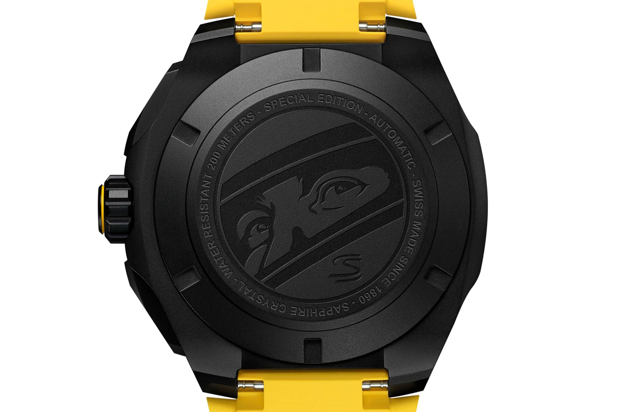 The yellow-painted crown, the yellow ring between the bezel and case, and the newly designed pushers at 2 and 4 o’clock demonstrate TAG Heuer’s ongoing attention to detail in the design of the Senna timepieces. This is also evident in the screw-down case back, which is engraved with Ayrton Senna’s piercing gaze through the visor of his helmet and, of course, the S logo.