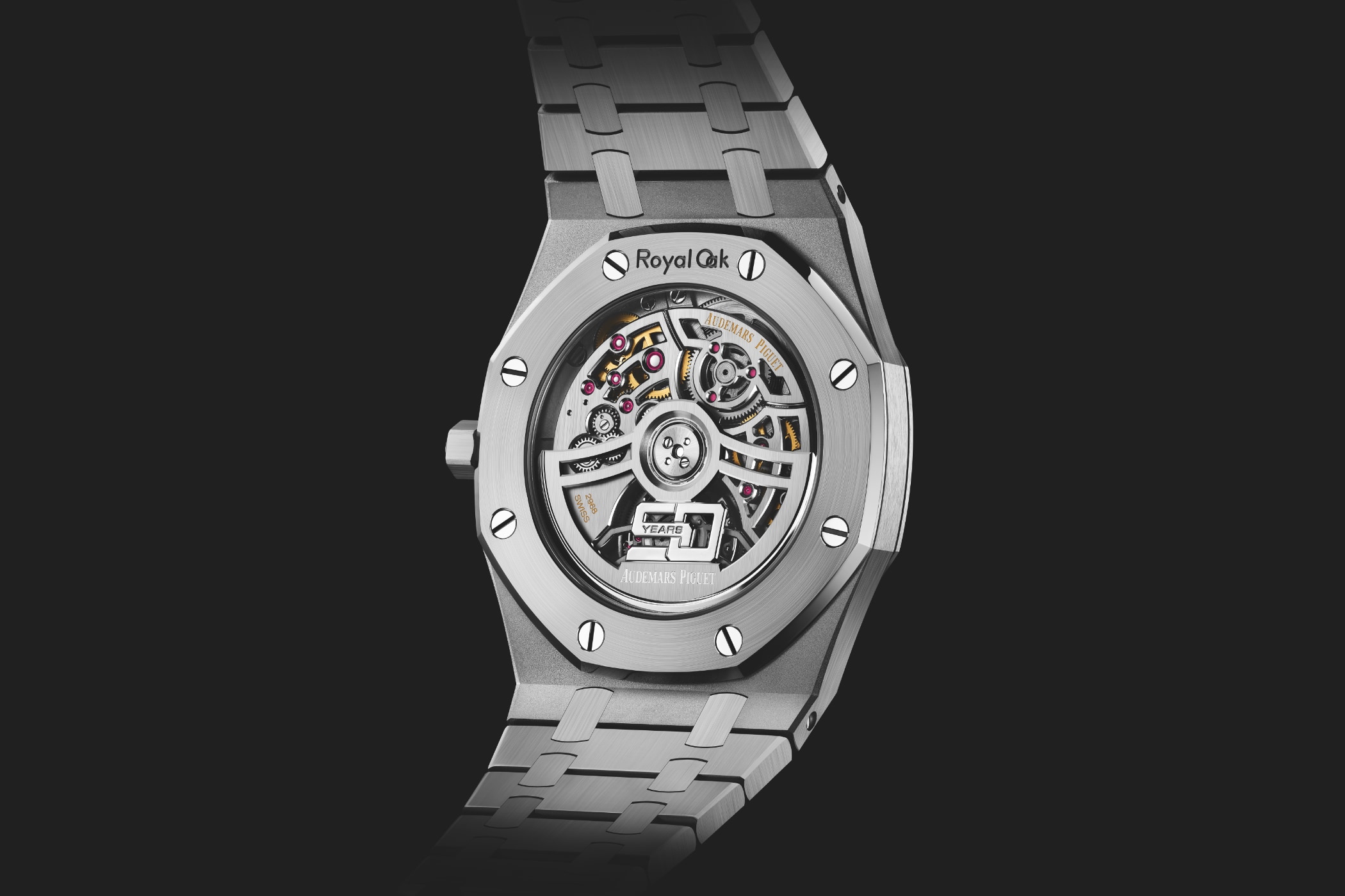 On the back is the “50-YEARS” oscillating weight, which celebrates the 50th anniversary of the Royal Oak. Here it consists of rhodium-plated 22-carat rose gold and supplies the barrel with a maximum power autonomy of 50 hours. In total, the movement consists of 226 parts and measures only 3.4 mm in height. It operates at a frequency of 3 hertz. Last but not least, decorations include polished inner angles and modern line-cut motifs.