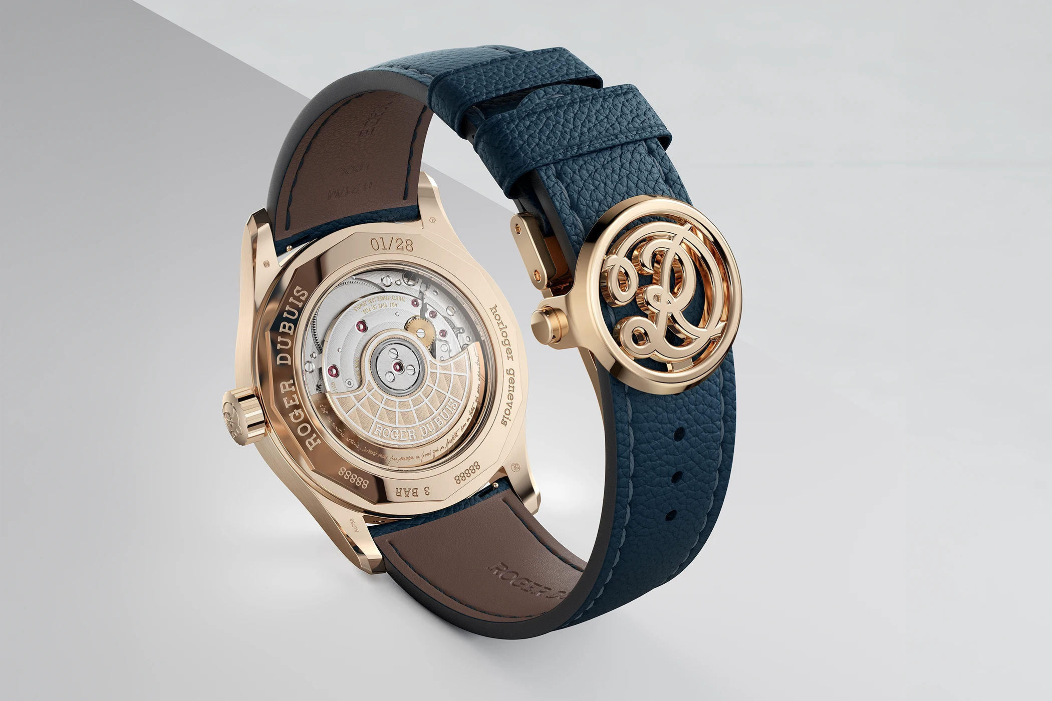 The case of the Roger Dubuis Hommage La Placide Perpetual Calendar is crafted from 18-carat pink gold (750/1000) and measures 38 millimetres in diameter with a height of 11 millimetres. It features a sapphire caseback that reveals the finely finished calibre RD1472, while also bearing the individual limitation number of each piece – from 01/28 to 28/28. The water resistance is rated at 3 bar (30 metres). The watch is fitted with a blue interchangeable leather strap, secured by a pin buckle adorned with the historical Roger Dubuis emblem.