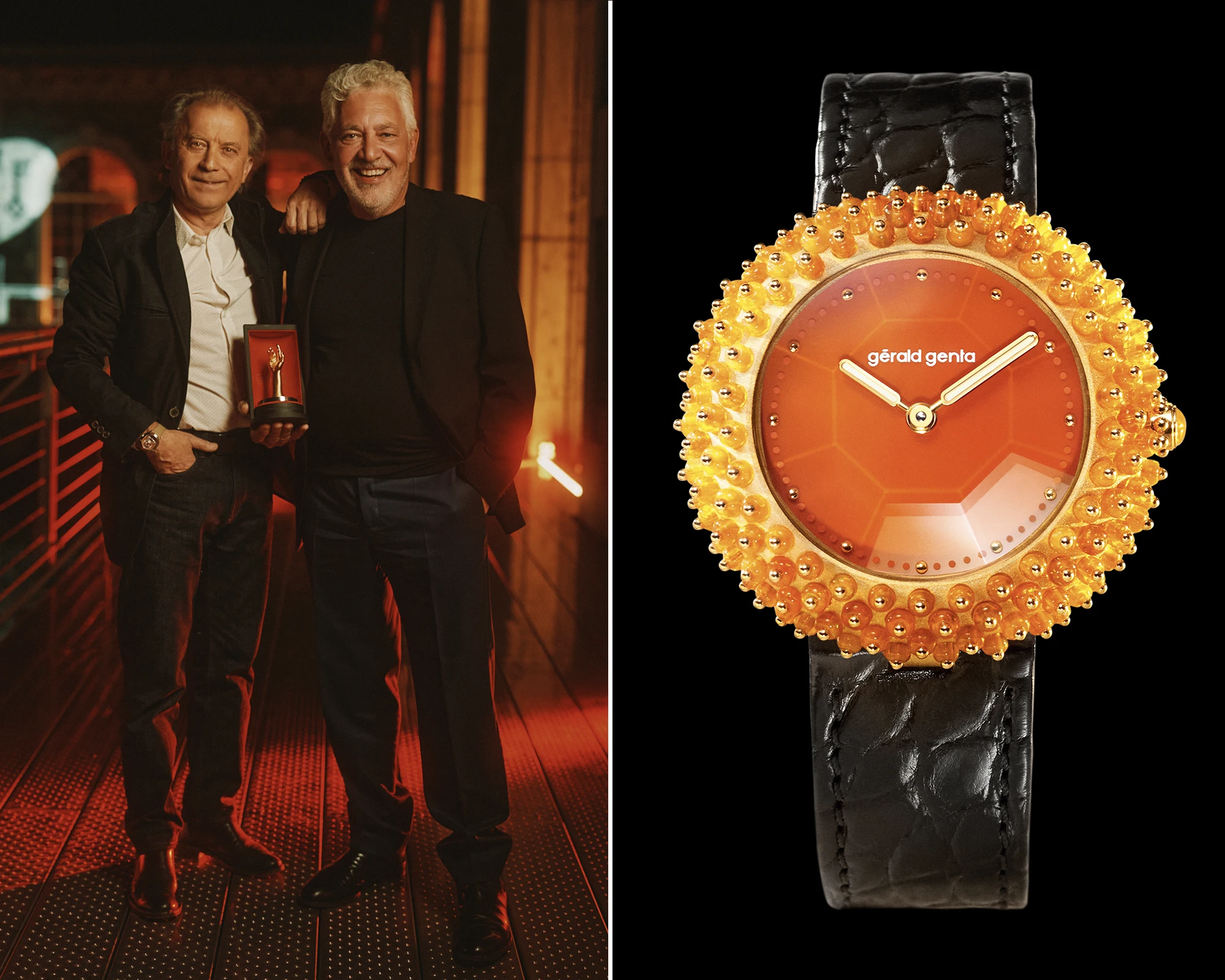 In the Ladies’ Watch Prize category, the Gentissima Oursin Fire Opal claimed the win. The model once again draws on Gérald Genta’s design language, translating it into a 36.5 mm yellow-gold case set with 137 individually mounted fire opals. An orange carnelian dial with a distinctive texture picks up the tones of the opals. Inside, the automatic calibre GG-005 is at work – a modified Zenith Elite movement featuring a newly designed 18-carat yellow-gold oscillating weight. A faceted sapphire crystal and a slightly octagonal inner bezel reference the characteristic lines of the Gentissima collection. Both the case surfaces and the dial details are rendered entirely in yellow gold.