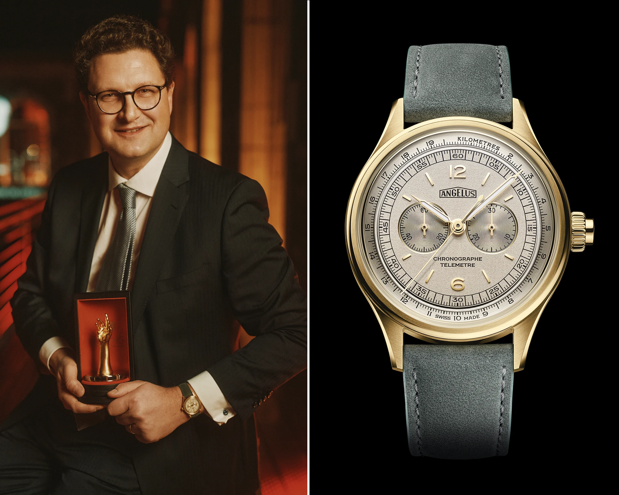 The Angelus Chronographe Télémètre Yellow Gold won in the Chronograph Watch Prize category, which honours the best chronograph of the year. Released in April this year as a 15-piece limited edition in yellow gold, the Chronographe Télémètre forms part of the La Fabrique collection and, with its 37 mm diameter, is the smallest Angelus model to date. The case, with its sculpted, curved lugs, draws on the brand’s historical aesthetic. The off-white dial combines a satin-brushed chapter ring with a grained centre, separated by a diamond-polished ring; the small seconds and 30-minute counter feature circular graining, while the applied indices are made from 3N gold. The watch is powered by the in-house hand-wound calibre A5000 – an integrated mono-pusher chronograph with a 42-hour power reserve, 3 Hz balance, column wheel, and horizontal clutch. Measuring 4.20 mm in height and 24 mm in diameter, the movement fits perfectly within the compact case format.