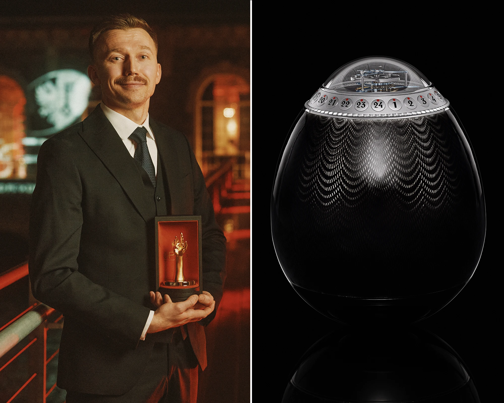 Anton Suhanov’s St. Petersburg Easter Egg Tourbillon Clock reinterprets the Fabergé egg in a modern, functional form. It consists of a polished stainless-steel base, a guilloché silver shell as the outer case coated with transparent enamel, and a domed sapphire crystal above the tourbillon and time display. A rotating bezel is used to set the time across all 24 time zones and allows the seconds to be read, as the tourbillon completes one revolution in 24 seconds. The sector for Moscow and St. Petersburg is visually highlighted. This model received the Horological Revelation Prize, a GPHG special category recognising brands that have been commercially active for less than ten years and have demonstrated convincing horological quality in a short period.