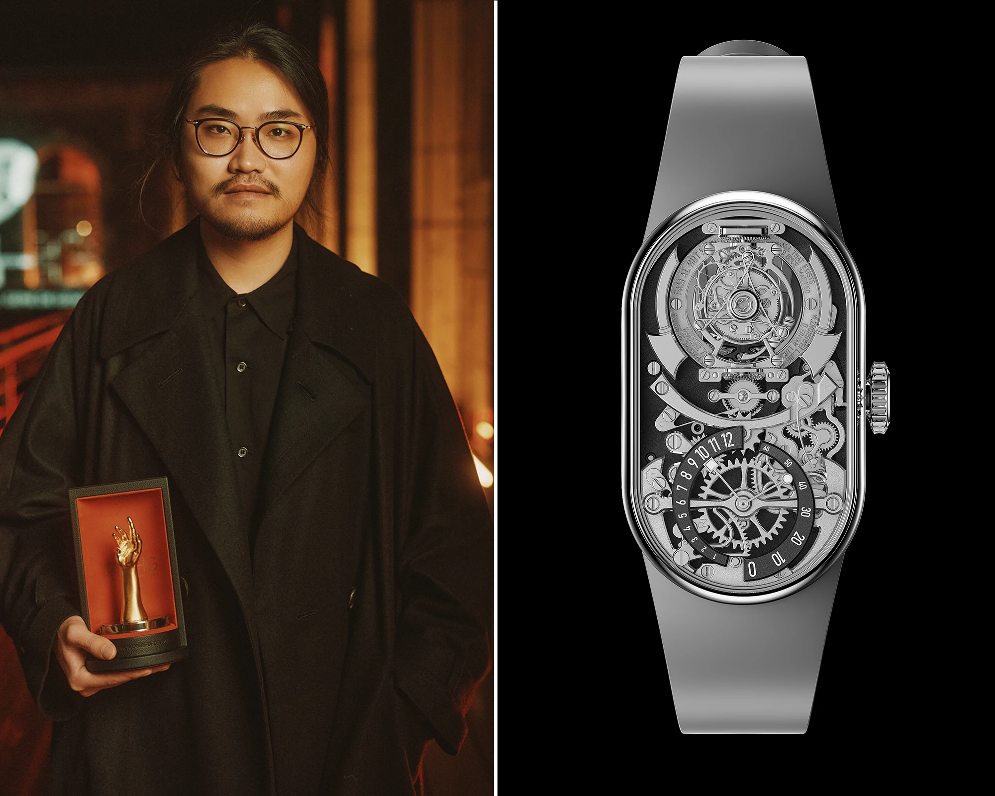 The Audacity Prize at the GPHG is a special award for watches that demonstrate an unconventional approach to timekeeping. This category is not guaranteed to be awarded every year. The winner this time was the Mark 1 from Chinese watch brand Fam Al Hut. With dimensions of 42.2 × 24.3 × 12.9 mm (17 mm at the highest point of the tourbillon), the Fam Al Hut MARK 1 Möbius is one of the most compact bi-axial tourbillon wristwatches available. The watch is made of stainless steel and features a lugless case with a concave polish and domed sapphire crystal. It combines a bi-axial tourbillon with double retrograde displays for hours and minutes, as well as a jumping hour mechanism – a configuration that has never before been implemented in a wristwatch. Inside, the hand-wound calibre M-01t operates at a frequency of 3 Hz (21,600 vph) and offers a power reserve of around 50 hours.