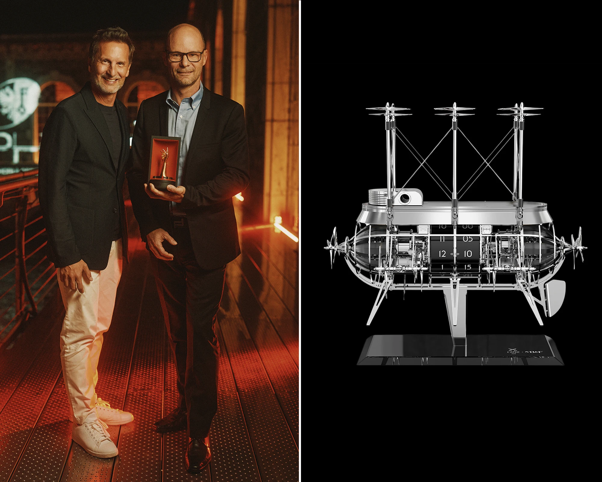 The Albatross L’Epée 1839 X MB&F is a tabletop automaton weighing nearly 17 kilograms and measuring 60 × 60 × 35 cm, composed of 1,520 components. It combines a time display on rotating discs with an hour-striking mechanism and an elaborate propeller automaton. The hours strike every hour, followed by a single strike on the half-hour; simultaneously, 16 pairs of propellers start moving, their direction of rotation mirrored on the left and right. A sophisticated mechanism, akin to a mechanical computer, allows multiple operating modes – full operation, complete rest, propellers only, striking mechanism only – as well as a recall function to trigger the selected combination or run the propellers independently. Two independent movements are at work: a calibre with two barrels for time and the hour strike, manually wound via the front propellers (clockwise for the strike, counter-clockwise for time), running typically for eight days; and a separate movement for the automaton, its single barrel wound via the rear propellers with around a one-day power reserve. Made of brass, steel and aluminium, the Albatross L’Epée 1839 X MB&F references Jules Verne’s dirigible ‘Albatross’ in its form and concept. It is the first clock with a ‘propeller hour’ function to be awarded the Mechanical Clock Prize.