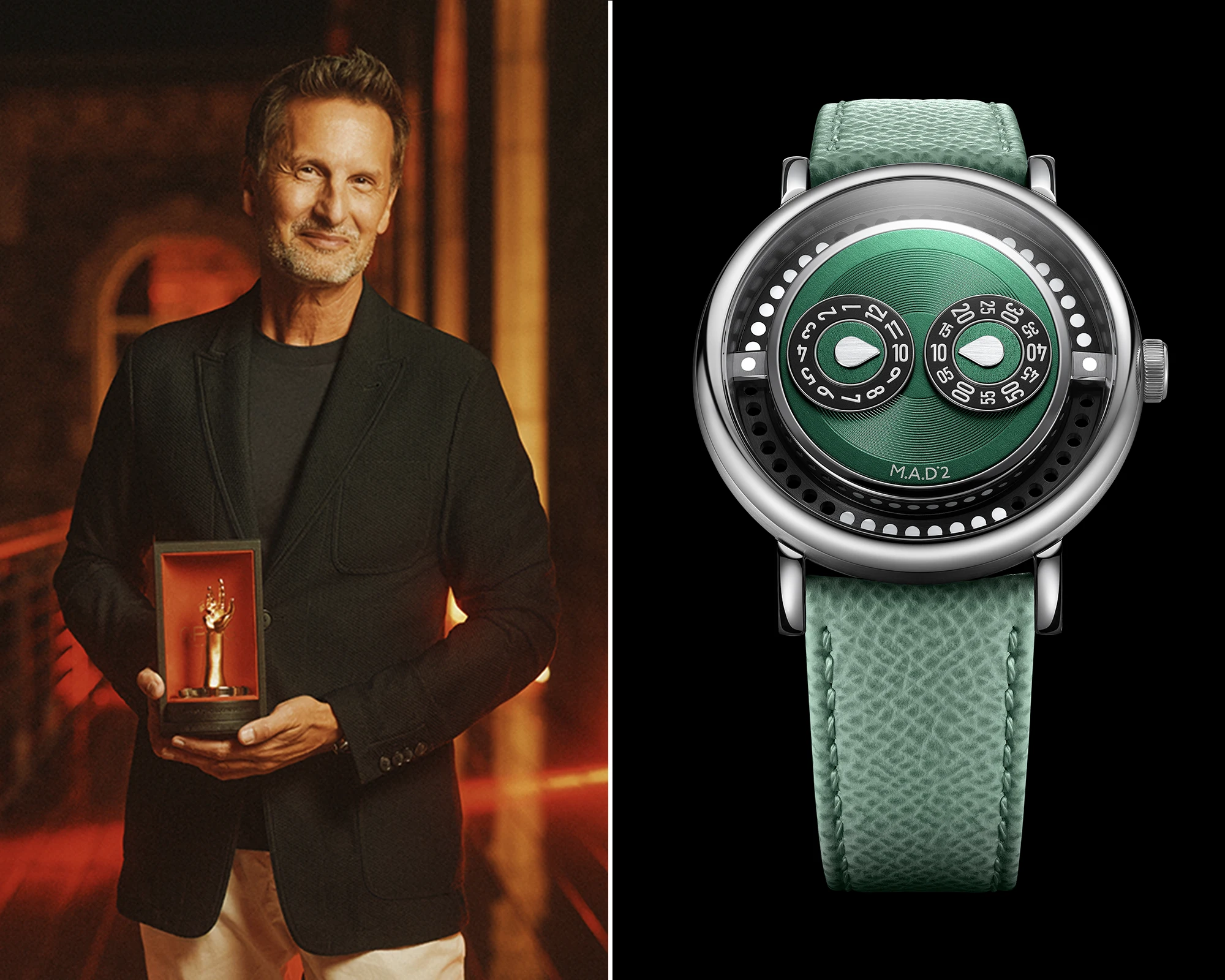 The concept behind M.A.D. Editions dates back to 2014, when Max Büsser, founder of MB&F, conceived the idea of creating a watch intended for his friends and family rather than for collectors or watch connoisseurs. The people who mattered most to him simply could not afford MB&F watches, which troubled him deeply. The first result of this idea was offered to 500 members of the ‘Tribe’ (as the brand refers to its long-standing partners, suppliers, and clients) in June 2021: the M.A.D 1 Blue, whose aesthetic was defined by a dial-side triple-blade rotor, a time display using two rotating cylinders, and a crown positioned at twelve o’clock in the style of a pocket watch. In March this year, the second chapter of the M.A.D. series followed: a watch that differs markedly from the M.A.D 1 both in concept and appearance. Designed by Eric Giroud – designer and long-time friend of MB&F – this timepiece is a love letter to 1990s club culture. This is reflected above all in its dial, inspired by the Technics SL-1200 Mark 2 turntable that once spun the house beats of the era. The main section of the dial therefore features two subdials for hours and minutes, each modelled after a DJ mixer’s turntables. Housed in a 42 mm case, the M.A.D.2 Green secured the GPHG 2025 Petite Aiguille Prize this year. The Petite Aiguille Prize honours the watch in the mid-price segment between CHF 3,000 and 10,000 that offers the most compelling overall package.