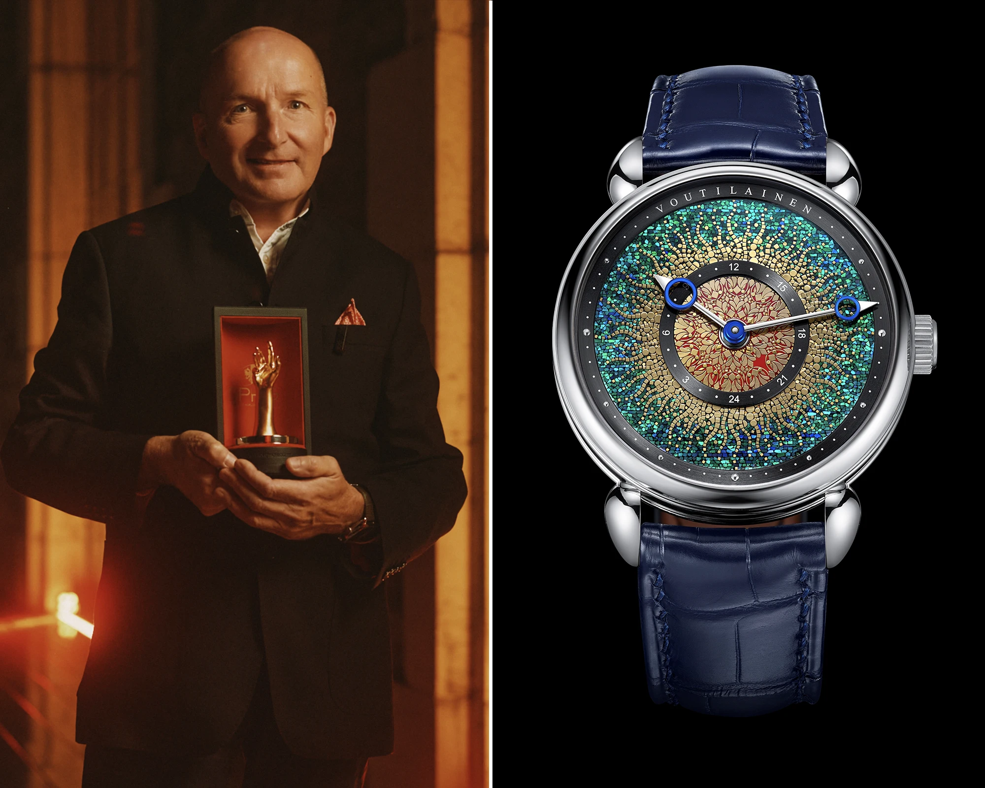 With the 28GML SOUYOU, presented in June this year, Voutilainen unveiled a pièce unique featuring a dial created by Japanese artist Tatsuo Kitamura. The dial showcases a highly contrasting colour composition of blue-green combined with gold and red tones, produced over more than a thousand hours of manual work using urushi lacquer, gold powder, cut gold leaf, and abalone inlays – decorative elements fashioned from the iridescent inner shells of abalones (sea ears). Home time is shown on a central 24-hour disc, while local time is set via the crown. The hand-crafted calibre 28GML measures 30 mm, operates at 18,000 vibrations per hour, and uses a large free-sprung balance with rose-gold weights, a Breguet overcoil on the outside, and a rare Grossmann inner curve. The movement comprises 211 components, has 27 jewels, a 65-hour power reserve, and hand-finished parts made of German silver and gold. As a one-of-a-kind piece, it earned the Artistic Crafts Watch Prize, recognising it as this year’s most outstanding work of artistic craftsmanship.