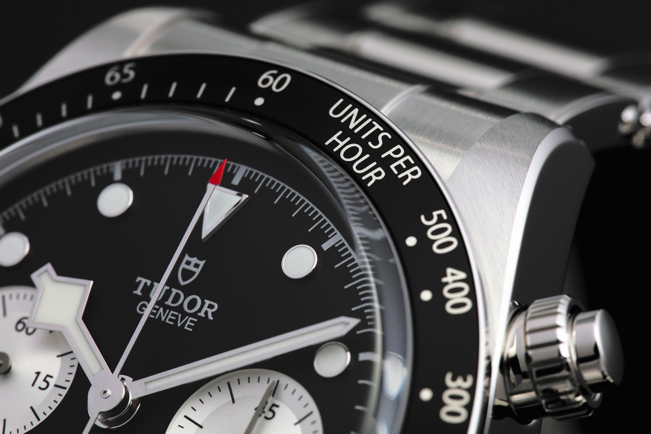 Two domed dial options are available. This includes opaline (white) with black counters, or black with silver counters. While not strictly necessary for a chronograph, TUDOR transform the Black Bay Chrono into an everyday watch by including a date window at 6 o’clock. As well as displaying the hour using TUDOR’s “Snowflake” hand, the chrono’s seconds hand helpfully has a red tip for the sake of legibility.