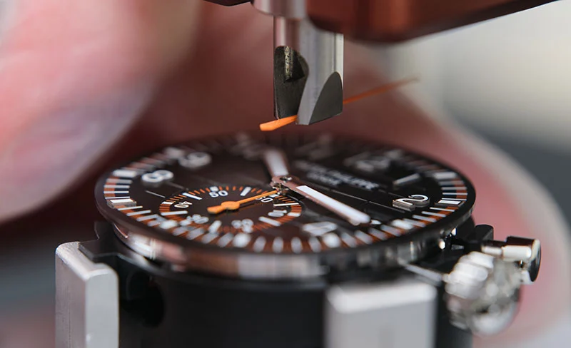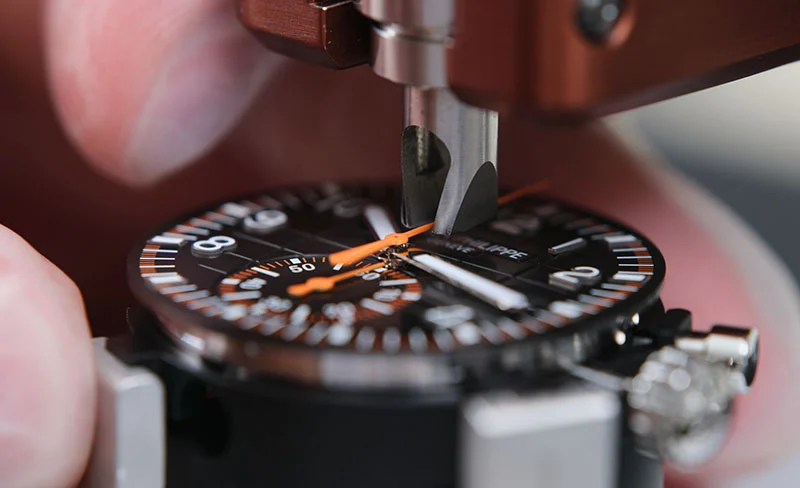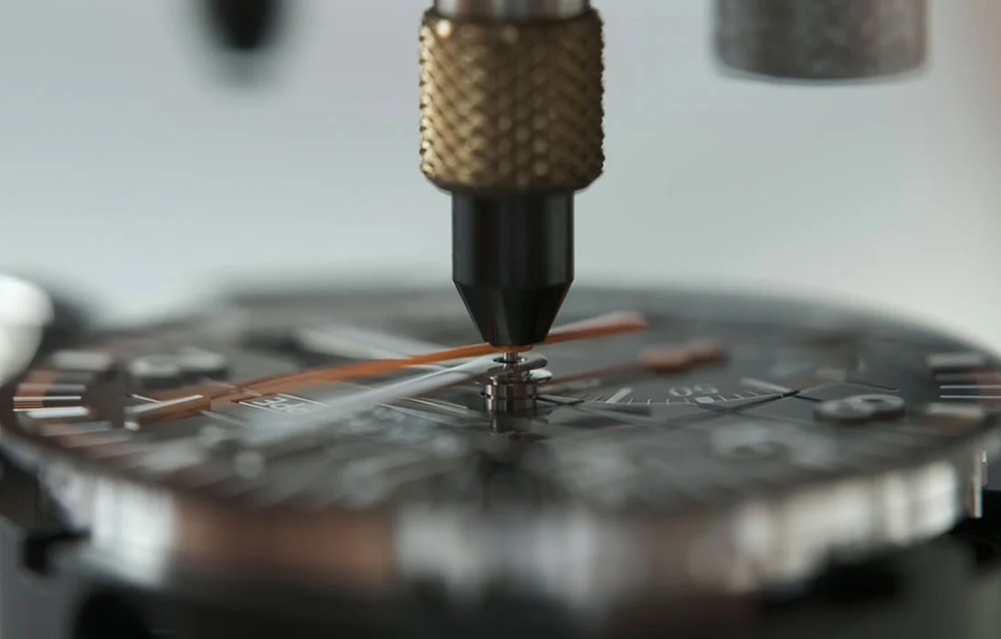 Nachdem das Werk einreguliert wurde, das Zifferblatt montiert ist und Stunden- und Minutenzeiger korrekt auf den Datumssprung gesetzt sind, kann der Uhrmacher die Chronozeiger setzen. Der Zentrumsekundenzeiger bedarf dabei einer besonderen Behandlung, da auf ihn wegen der Beschleunigung beim Rückstellen, seiner Länge und der dünnen Welle starke Kräfte wirken. Würde er normal aufgeklemmt wie die anderen Zeiger, könnte er sich beim Nullstellen irgendwann lösen. Um das zu verhindern, wird der Stahlzeiger mit einem Forcetest-Gerät mit vorgegebener Kraft aufgepresst. Deshalb muss er auch bei jeder Wartung ersetzt und das Zeigerfutter mit einer winzigen Aale so weit aufgerieben werden, dass er zu einem Drittel aufgesetzt und dann festgepresst werden kann.